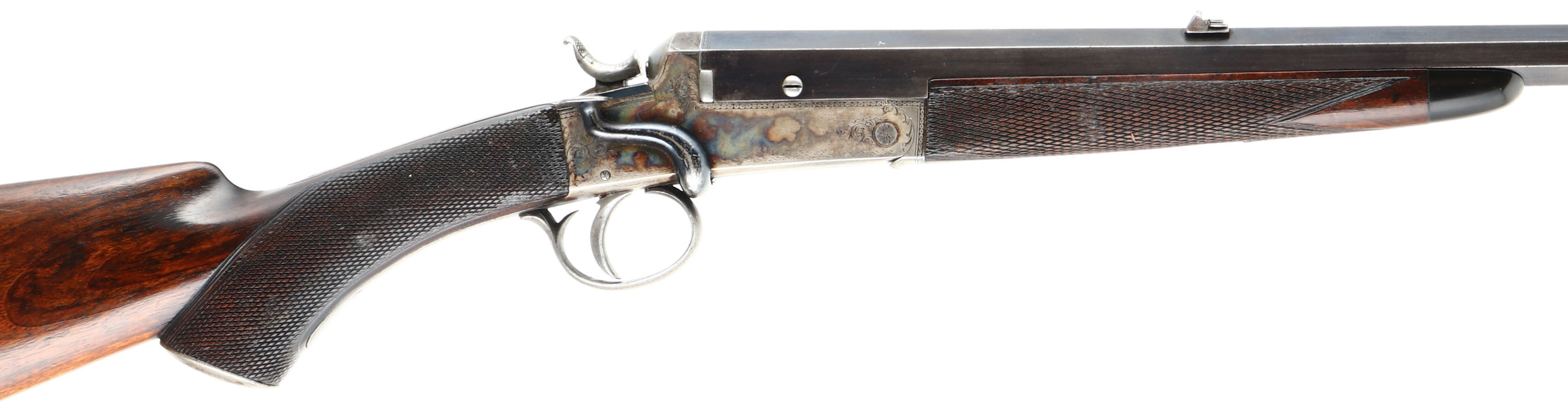 Peter Small, Rook Rifle, CAL: .300 Rook, MFG: N/A, SN: 66236, Side Lever Break Action Single Shot Rifle, 26'' octagon barrel, Partially Matted. The barrel flat is marked ''P.SMALL.28 PILGRIM ST NEW CASTLE ON TYNE''. The original checkered & capped pistol grip stocks, with ebony forend tip, are excellent, having been professionally restored. There is a blank oval nameplate on the belly. There are minor contusions & handling marks to the excellent finish. The original metal blue finish on the barrel rates 85%, with the edges showing loss. The case-hardened receiver & pistol grip cap still display vivid case-colors, while other areas have faded to metal gray. Fantastic scroll & accent hand engraving found on receiver back of barrel, trigger guard, pistol grip & small medallion inlaid into forend. Bore is excellent, but with light intermittent spotting amongst strong rifling. The barrel holds a 3-tier folding leaf rear sight & a blade front sight. Manufactured without a buttplate, but with serrated buttend. Comes with a full box of .300 Rook 90gr Ld FL PT ammunition.* FFL or C&R Req. - Value: 2000 to 3000