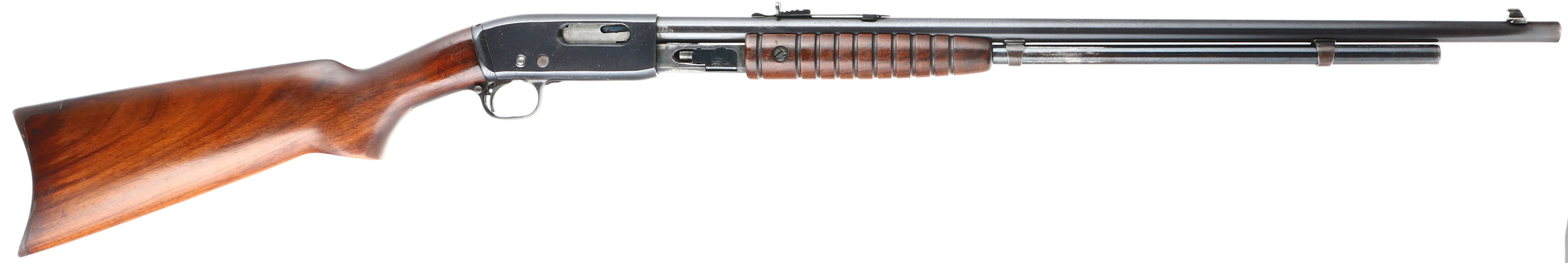 Remington, Model 25, marked 25-20, MFG: 1923-36, SN: 23241, Pump Action Take-down Rifle, 24'' round barrel. The original flat pistol grip wood stocks are excellent & solid. The finish is excellent, but with minor wear, scuffs & minor handling marks. The original metal blue finish rates 95% overall. Bore is excellent. Barrel carries an adjustable rear & small blade front sights. Remington stamped crescent metal buttplate. The barrel has two screw filled holes at the receiver end from possible scope mounting. These smaller caliber & light weight pumps were popular for small game & varmint hunting & most saw heavy use. Less than 32,000 Mod 25 rifles were produced in the two caliber, 32-20 & 25-20. An overall excellent condition & collectible rifle. FFL or C&R Req. - Value: 1000 to 2000