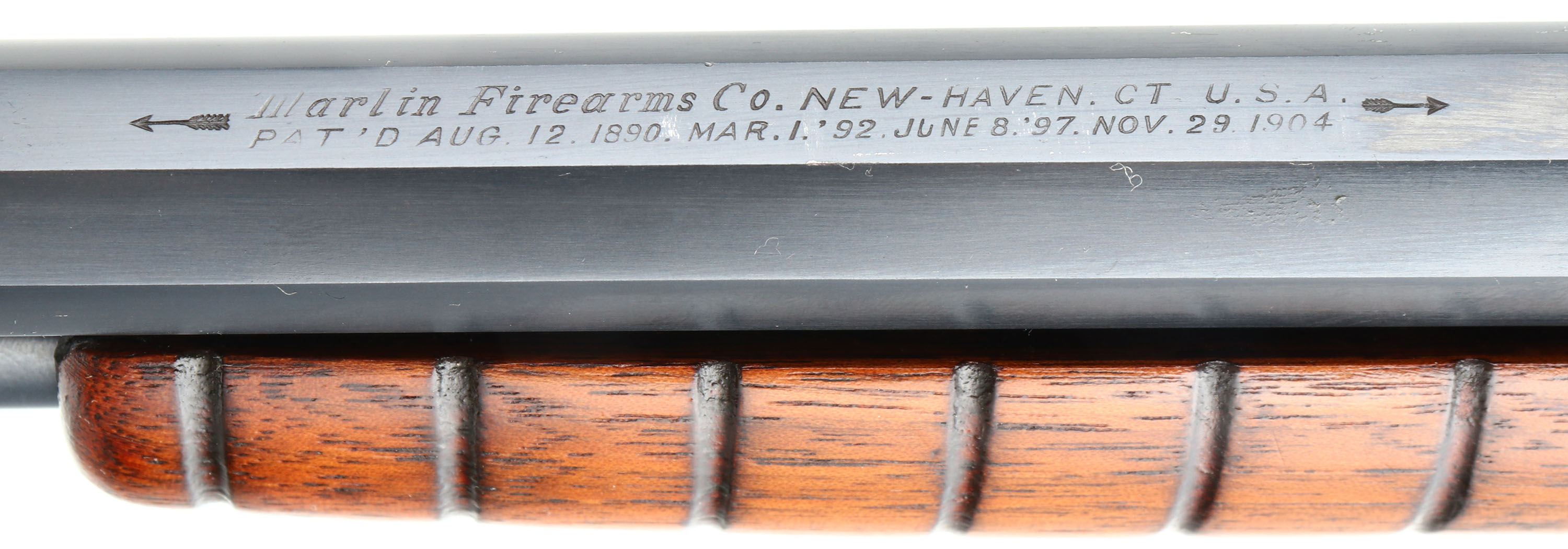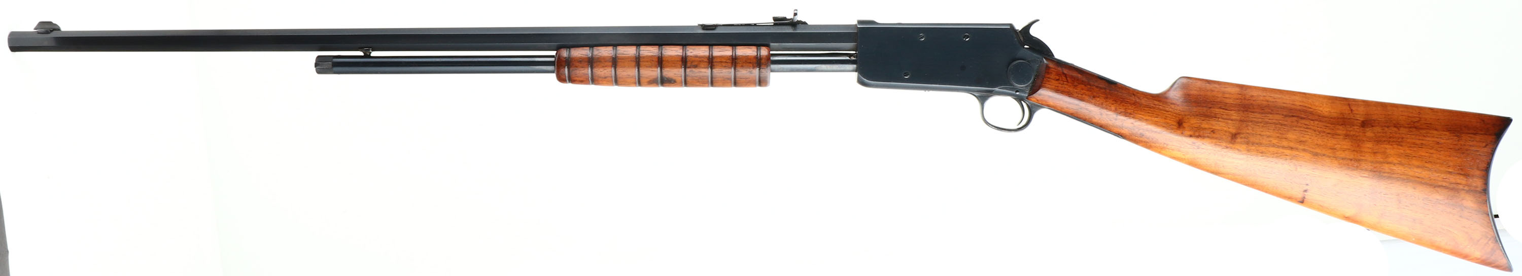 Marlin, Model 27S, CAL: 25 Rim Fire, MFG: 1913-18, SN: None, Pump Action Rifle, 24'' Tapered octagon barrel. The original straight grip wood stocks are good & solid. The stocks have been refinished & there are several remaining minor scrapes & contusions. The forend has a 4'' crack on the left side. The restored metal blue finish rates 98% overall. Bore is good, with some clean roughness amongst strong rifling. The barrel carries an adjustable rear & blade front sights. Stock carries the original crescent metal buttplate. FFL or C&R Req. - Value: 300 to 600