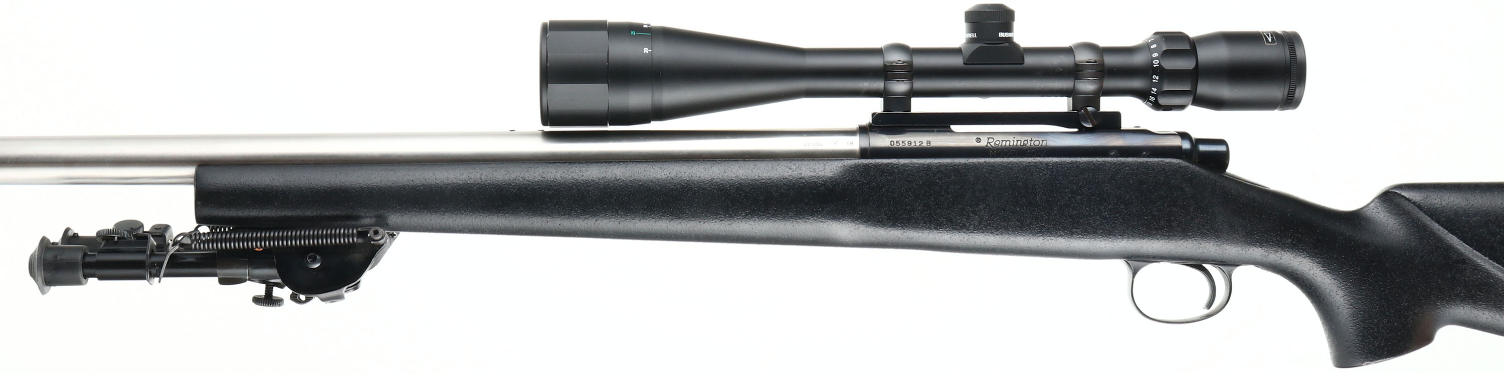 Remington, Model 40-XB KS, CAL: 22-250, MFG: 1987, SN: 055912B, Bolt Action Single Shot Rifle, 27 1/4'' barrel. Built by Remington Custom Shop, first year production. The original raised cheek & flat pistol grip Kevlar stock, Aramid fiber finish, is excellent. There are a few handling marks to the finish. The bright finished stainless steel barrel is excellent. It comes tapped & drilled with filler screws for sight mounting, but come without sights from the factory. The metal blue finish on the receiver rates 98%. Bore is minty. The receiver carries a Bushnell Weatherproof 6-18x40 scope, held by a Redfield base. Stock carries a Remington solid recoil pad & an unmarked bi-pod. A must-have rifle for bench or target shooters. FFL Req. - Value: 1600 to 2400