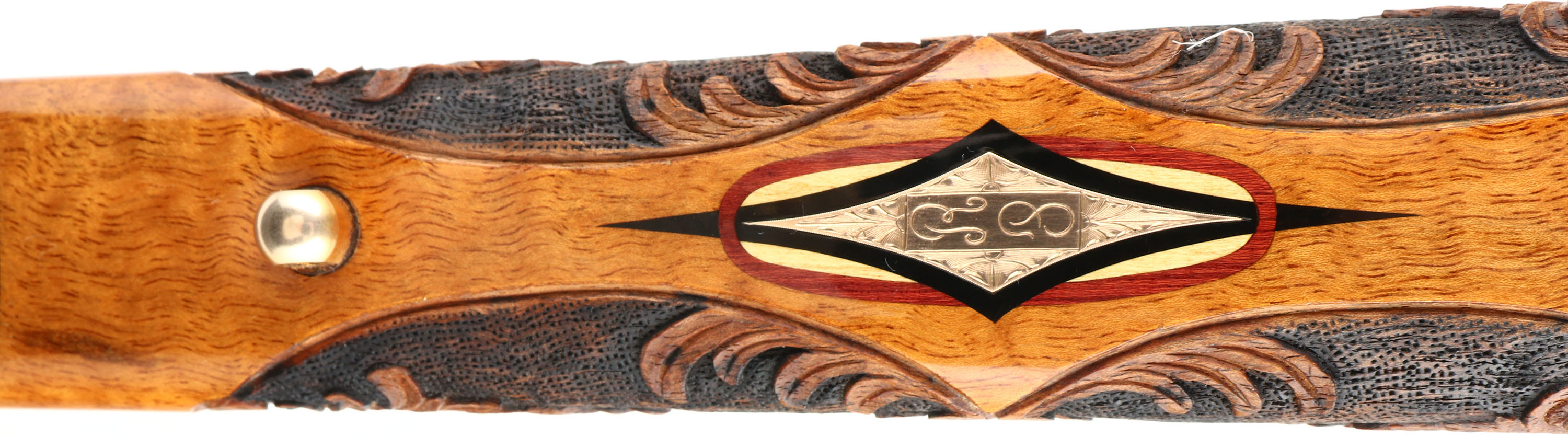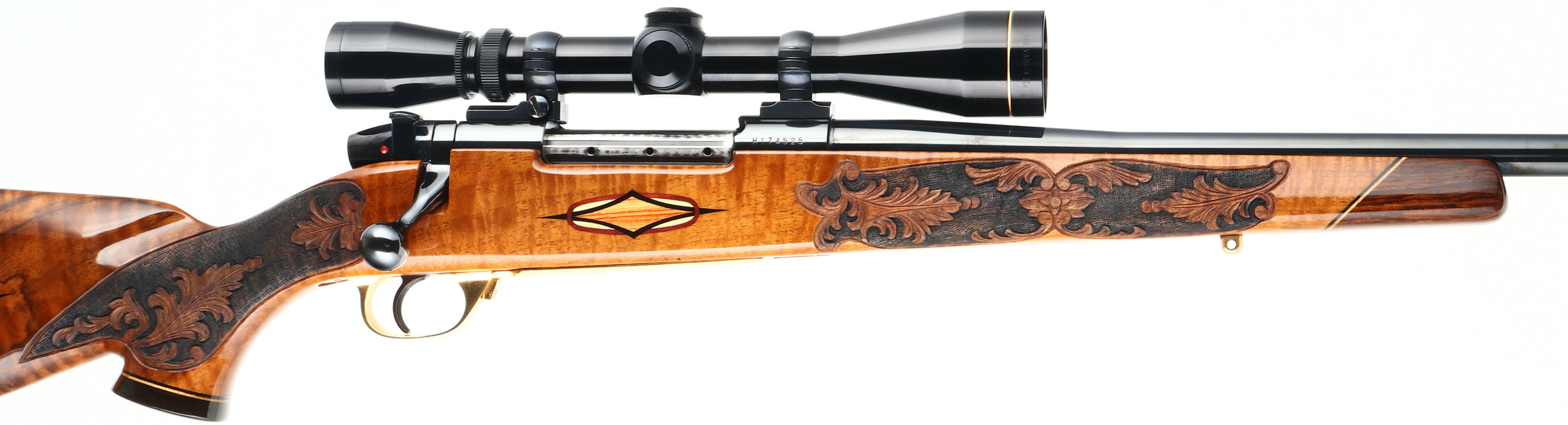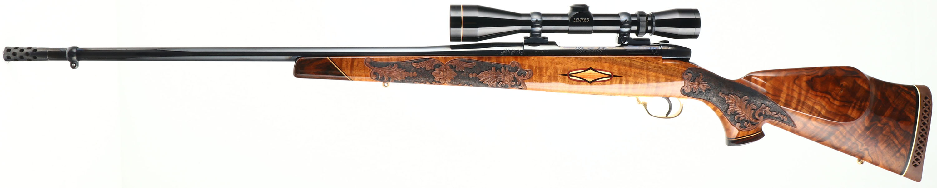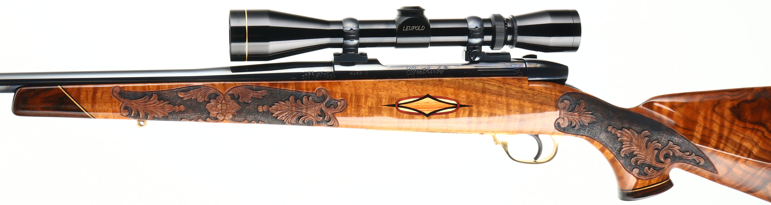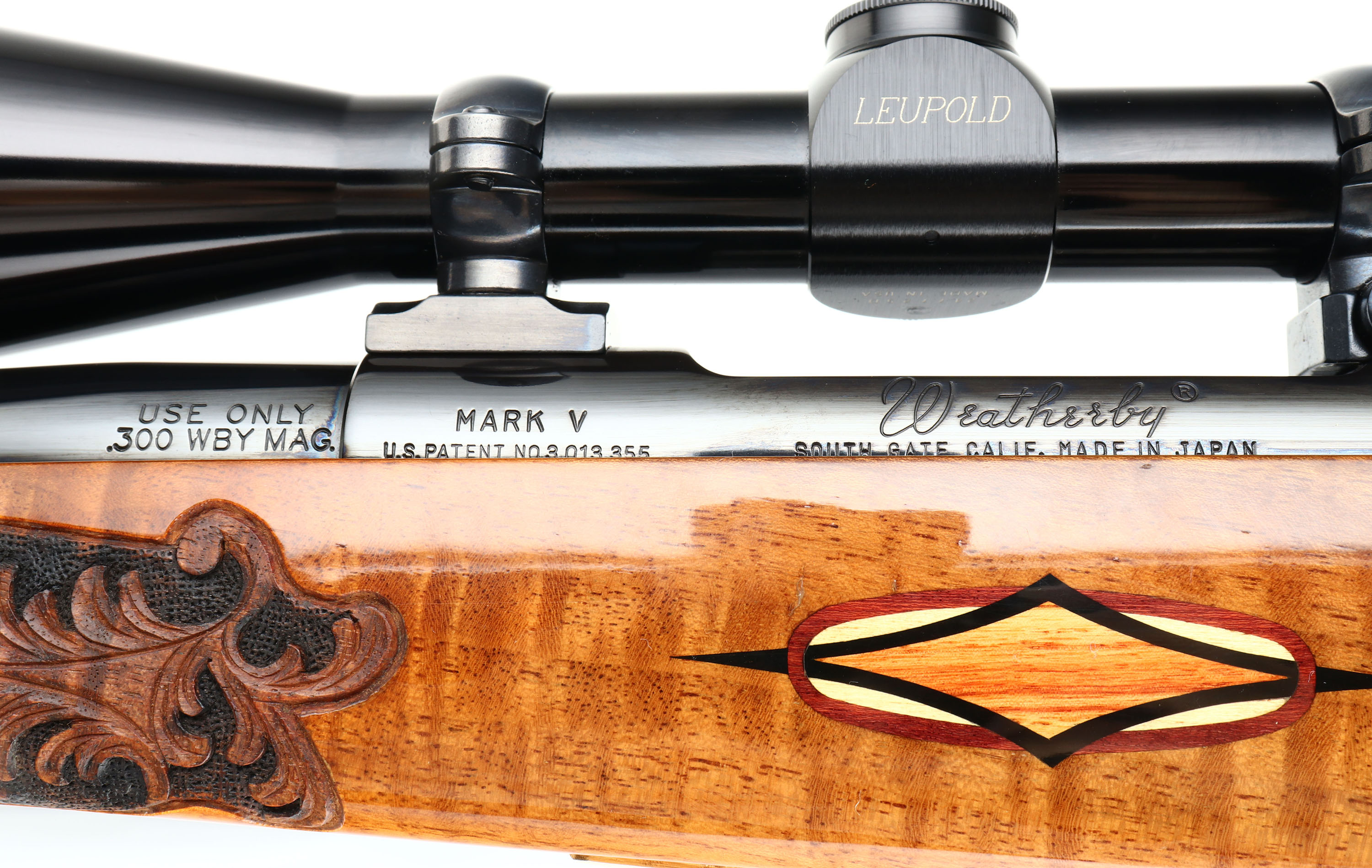 FABULOUS Factory Custom Shop Weatherby Custom Mark V, CAL: 300 Weatherby Mag, MFG: 1972-94, SN: H174525, Bolt Action Rifle, 25'' Tapered barrel, including muzzle break. The stock displays expertly executed & extensive, deep relief scroll leaf carvings & stippled background. The floor plate & inlaid diamond in the bottom of the forearm have beautiful hand accent engraving. The rifle mounted with a very finely figured, cheeked & pistol grip, Monte Carlo stock. The rippled & fiery grain within the walnut stock is fantastic. Stock features 3 layer contrasting rose wood forend tip & grip cap. The stock is nicely inlaid with four multi wood diamond/oval designs, with the one on the underside of the forend also containing the gold metal inscription plate accented with hand engraving. The original high gloss finish is excellent with only a couple of very minor handling marks. The original high luster metal blue finish is 99%. Bore is nearly mint. Rifle carries a Leupold 3x9 Vari-XIIc Scope, no open sight provisions. Buttstock carries a Weatherby, ventilated, brown rubber recoil pad. Jeweled bolt. Sling studs. This fabulous custom shop Weatherby is an example of their finest hand craftsmanship & is highly collectible as a true work of art. FFL Req. - Value: 4000 to 6500