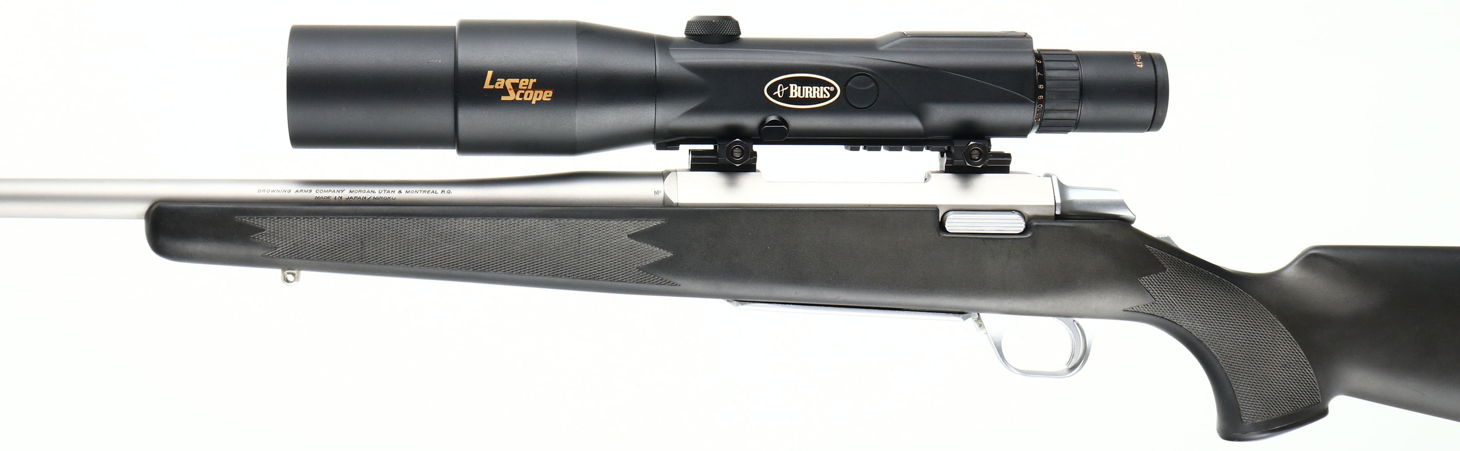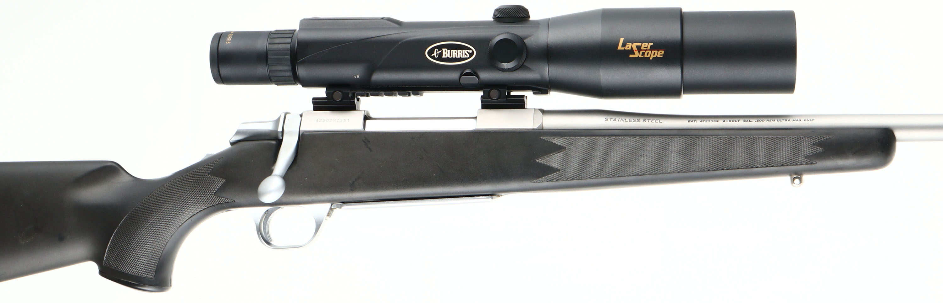 Browning, A- Bolt, CAL: 300 Rem Ultra Mag, MFG: Modern, SN: 42502MZ351, Bolt Action Rifle, 26'' barrel (27 3/4'' w/ muzzle break). The synthetic, checkered & flat pistol grip stock is excellent. There are light handling marks from light use. The stainless steel finish rates 98% overall. Bore is excellent. The receiver carries a Burris Laser Scope 4x-12x. These scopes (when new) retail for around $1000. (Note: If used for hunting, these integrated laser rangefinder scopes are not legal in some states, because of the advantage they provide.) No open sight provisions. Stock carries a LimbSaver solid recoil pad. Sling studs. A ready-to-go hunting rifle, with a fantastic scope. FFL Req. - Value: 1000 to 1500