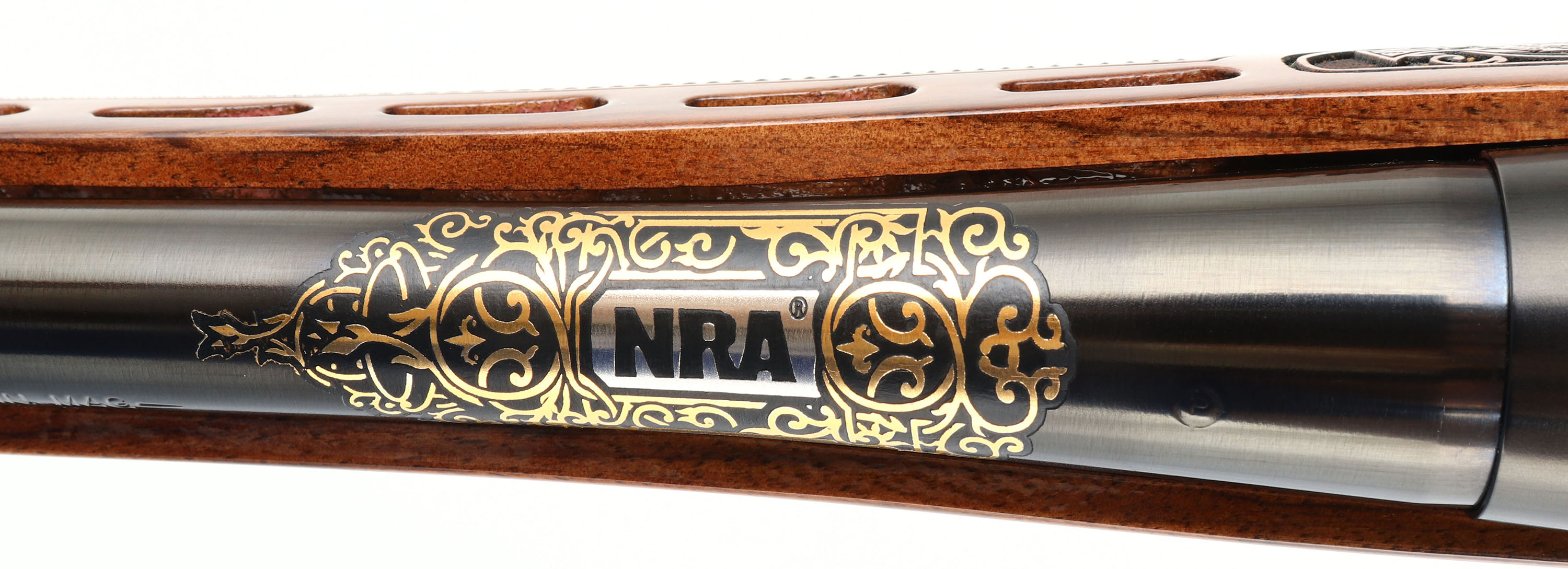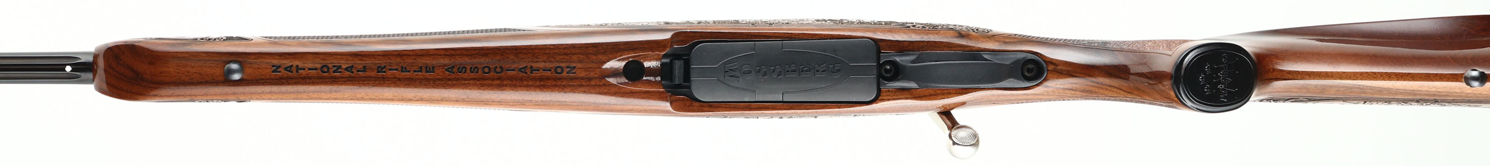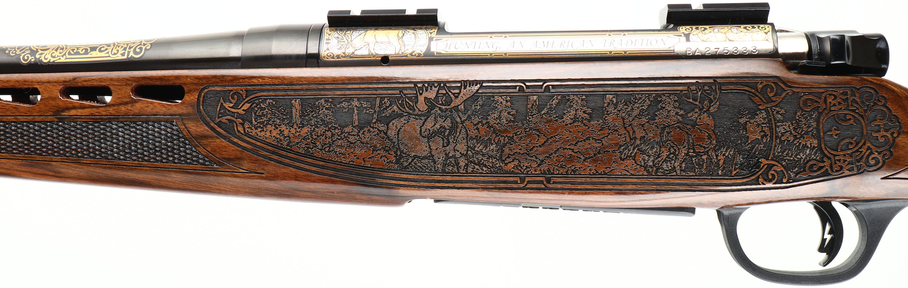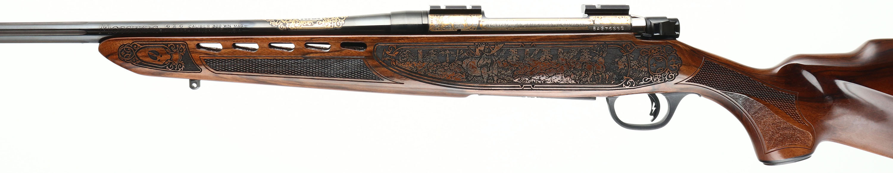 Mossberg, Model 4X4 Hunting Tradition NRA Idaho Commemorative Special Edition, CAL: 300 WIN MAG, MFG: 2012, SN: BA275333, Bolt Action Rifle, 24'' free floating & fluted barrel, 26'' with the muzzle brake. This firearm was a special fund raising edition for the NRA by American Legacy Firearms. There were just 100 rifles produced for each state, this being # 12 of 100 for Idaho. The American-walnut stocks are ornately engraved with wilderness scenes depicting a father & son sharing a hunt of two buck dear. The forearm displays engraved popular North American big-game animals of a bear, ram, deer & moose. The bottom of the fore-end is engraved with ''National Rifle Association''. The engraving on the stock was done by SWS Engraving in Hope, Ark., a plant owned & operated by Hanson. The stock is finished with an extra-durable coating to protect the engraving during normal use. All metal parts, including the barrel & receiver, are buffed, blued, engraved & then plated in gold, nickel or blue, as the design dictates. The left side having cow & bull elk, the right Prong horn & the ''NRA'' in silver & gold. The bolt is nickel-plated and then hand-jeweled. The metal work done by American Legacy Fireworks, Inc. The original checkered. engraved & capped pistol grip walnut stock remains mint. The original metal blue finish remains new. Bore is mint. The receiver holds a couple of scope blocks for future scope mounting, with no open sight provisions. Mossberg solid recoil pad & sling studs. Detachable mag. Steve Faler & American Legacy Firearms have a mantra, ''Life's too short to shoot an ugly gun!'' With these words in mind, they produced this fine NRA Special edition. The rifle comes in the original box, with packaging, booklet & paperwork packet, & Lock. Basically new old stock. These sold for $1795 back in 2012. FFL Req. - Value: 1500 to 2500