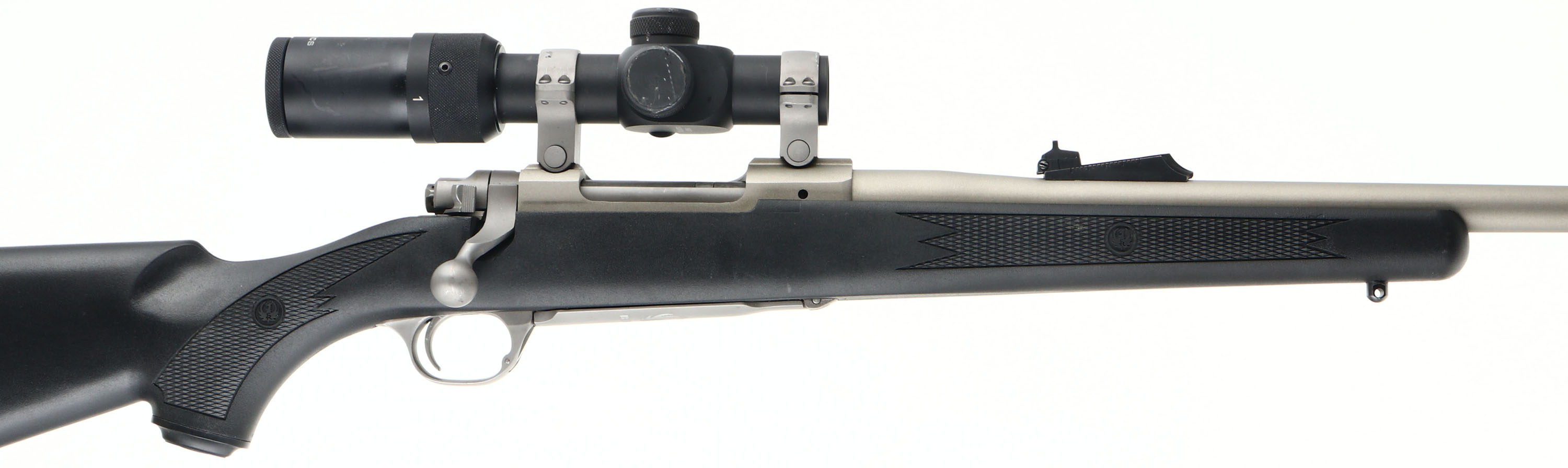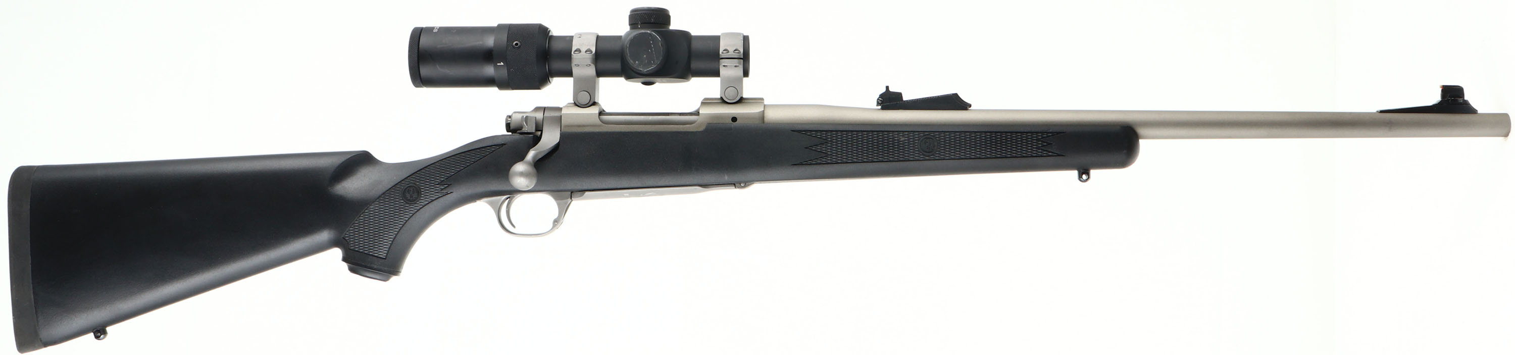 Ruger M77 Hawkeye, Custom Rifle, CAL: .358 WIN, MFG: Modern, SN: 711-43348, Bolt Action Rifle, 20 3/4'' Golden Ballistics barrel. The factory checkered & capped pistol grip synthetic stock is excellent. The satin silver finish is excellent, with minor storage marks. Bore is excellent. The barrel holds an adjustable rear sight & ramp elevated blade front sight. The receiver carries a U.S Optics 1x4 scope, with illuminated red dot. Stock carries a solid factory Ruger recoil pad. Sling studs. A quality custom production rifle in a big game caliber. FFL Req. - Value: 500 to 800