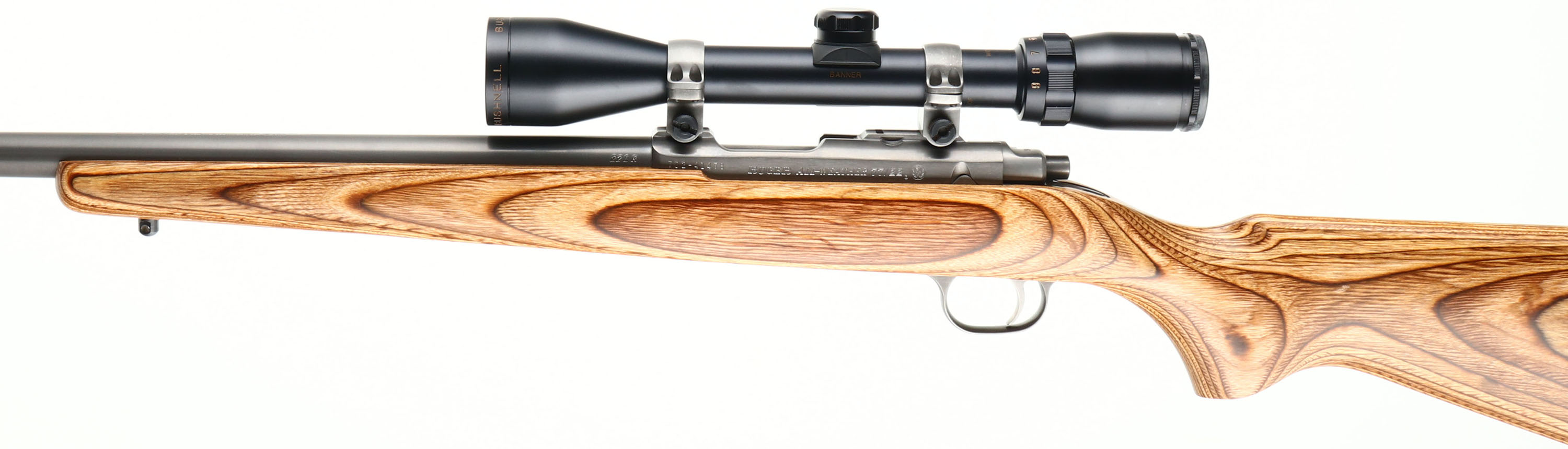 Ruger, All-Weather 77/22, CAL: 22LR, MFG: 2000, SN: 702-41478, Bolt Action Rifle, 24'' barrel. The laminated flat pistol grip stock is excellent. There are a few handling marks & dings to the clear coat finish. The matte gray ''All Weather'' finish on the barrel & receiver is excellent, rating 99% overall. Bore is excellent & minty. The receiver holds a Bushnell Banner 3-9x40 Wide Angle scope. No open sight provisions. Stock carries a factory Ruger solid black rubber recoil pad. Sling studs. FFL Req. - Value: 600 to 1000