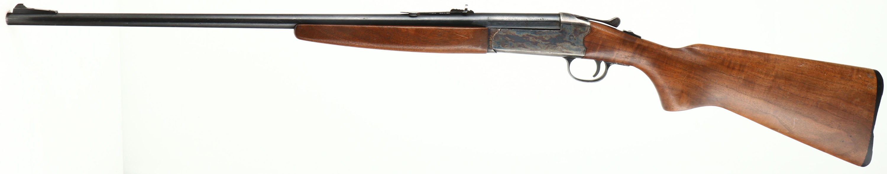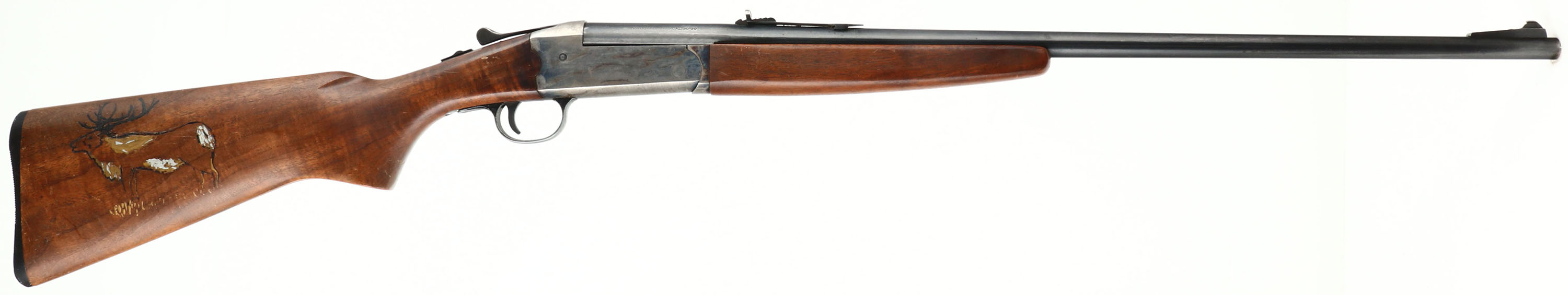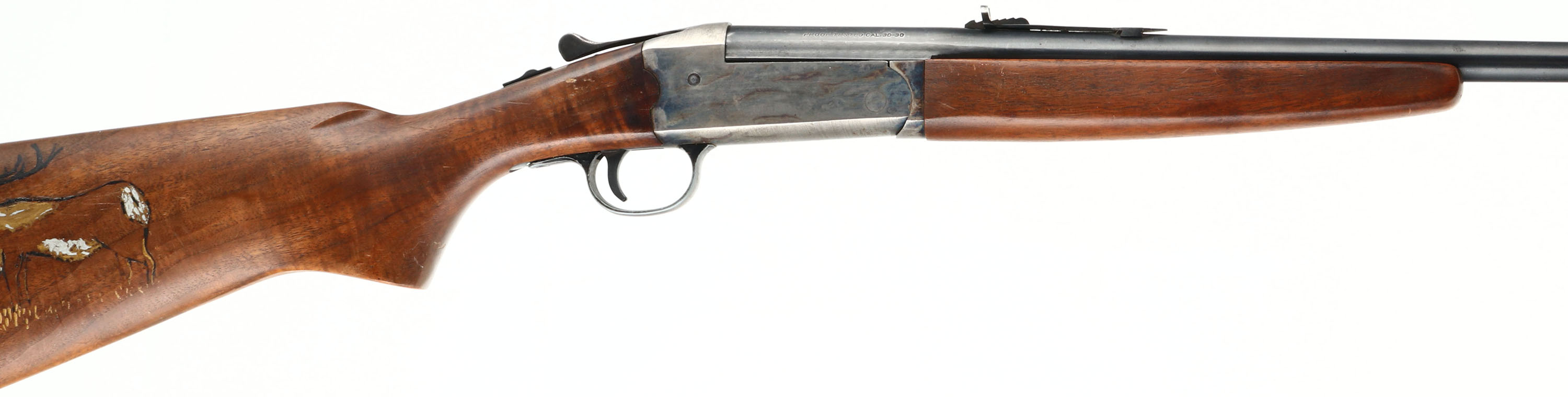 Savage, Model 219, .30-30, MFG. 1938-65, SN: None, Break single shot, Take-down, 26'' barrels. The original flat pistol grip wood stocks are very good & solid, retaining most of the original finish with few minor handling marks & scratches. The right side of stock has previous owner's painted artwork of a standing elk. The original factory blue finish on barrel rates 95%. The receiver display muted & fading case-colors. Original buttplate. Barrel carries an adjustable rear & ramped front blade sights. Bore is excellent. FFL or C&R Req. - Value: 150 to 300