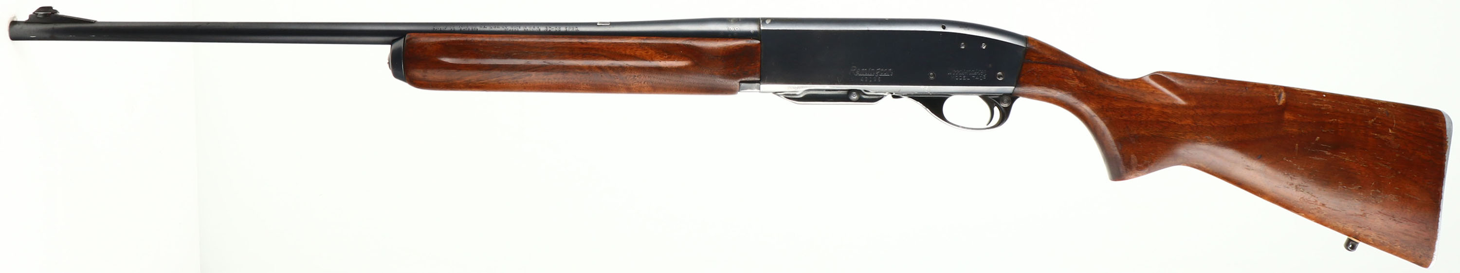 Remington Woodsmaster Model 740, CAL 30-06, MFG: 1956, SN: 49196, Semi-Auto Rifle, 22'' barrel. Second year rifle. The original flat pistol grip wood stocks are good & solid, despite 2'' stress cracks on each side of wrist emanating from the receiver. There is thinning & flaking of the original finish & some minor scrapes & contusions. The original metal blue finish rates 85% overall. Bore is very good & bright. The receiver carries four open holes on top from previous scope block mounting, an additional hole on the back left edge & two screw filled holes on the left side of receiver for side mount receiver sight mounting. The barrel holds a blank filled rear dovetail & blade front sight. Buttstock carries a Remington marked metal buttplate. Comes with a second removable mag. Single rear sling stud. FFL or C&R Req. - Value: 300 to 500