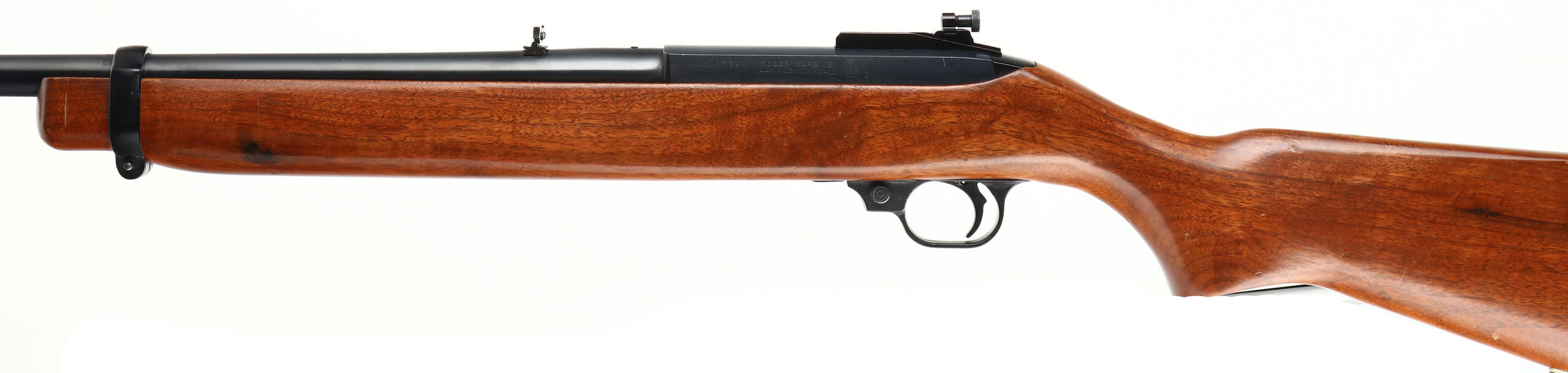 Ruger, Ruger Carbine .44 Magnum, CAL: .44 MAG, MFG: 1975-85, SN: 102-83848, Semi Auto Rifle, 18 3/4'' barrel. The original flat pistol grip stock is excellent, which minor contusions, scrapes & dings to the original finish. The is a tight 5'' grain crack in front of the mag loading port on the bottom of the forend. The metal blue finish on the barrel & receiver rates 97% overall. Bore is excellent. The chamber end of the barrel is tapped & drilled, with (2) filled screw holes & the front screw head is broken off. The receiver is tapped & drilled, with the two rear holes holding an adjustable Williams peep sight. The barrel holds a folding leaf rear sight & blade front sight. Factory rear sling stud & additional barrel band sling stud. Stock carries factory metal buttplate. Concealed within the stock is a tubular magazine that holds four rounds that are loaded shotgun style. FFL Req. - Value: 500 to 1000