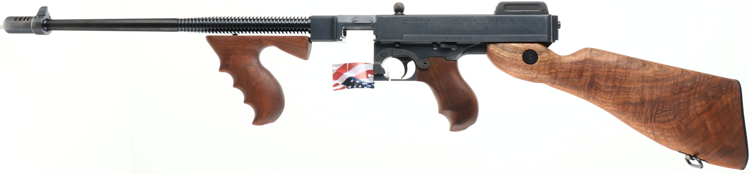 CASED & NEW Thompson Auto Ordnance Corporation, (Kahr Arms), 100 Year Anniversary Two Gun Set, Models Thompson 1927A-1 Rifle & Thompson 1911A1 GI Specs pistol., CAL: 45 ACP, MFG: 2016, SN's: A0A36283, KP2243, Semi Auto Rifle & Pistol, 16.5'' (18'' with compensator) & 5'' barrels. This is number 314 of 1500 sets produced to celebrate the 100 Year Anniversary 1916-2016 of the Thompson Auto Ordnance Corporation. Auto-Ordnance was a U.S. arms development firm founded by retired Colonel John T. Thompson of the United States Army Ordnance Department in 1916. Auto-Ordnance is best known for the Thompson submachine gun, used as a military weapon by the Allied forces in World War II, & also notorious as a gangster weapon used during the Roaring Twenties. Featured in the set is a deluxe replica of a Thompson 1927A-1 Carbine (Tommy Gun) & a Thompson 1911A1 GI Specs pistol. The deluxe American walnut vertical foregrip, pistol grip & fixed stock on the Tommy gun are mint, displaying beautiful wood grain & factory finish. The factory metal blue finishes are 99%+. The receiver is prominently engraved with the classic Thompson logo, limited edition numbers, & displays the words ''100th Anniversary'' on the matte black steel frame. The gun weighs 13 lbs. & has an overall length of 41''. Features include a pinned in front blade & an open rear adjustable sight. Bore is mint. Has the stick mag.