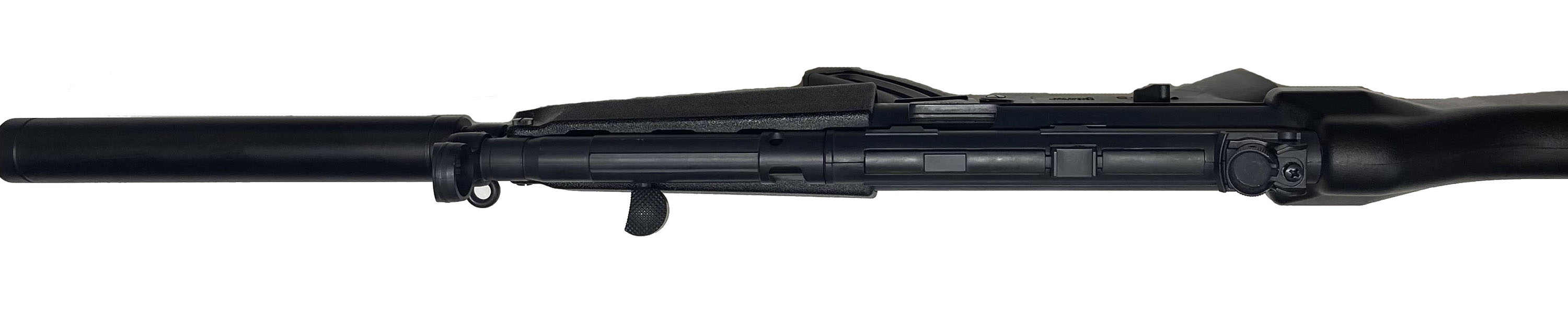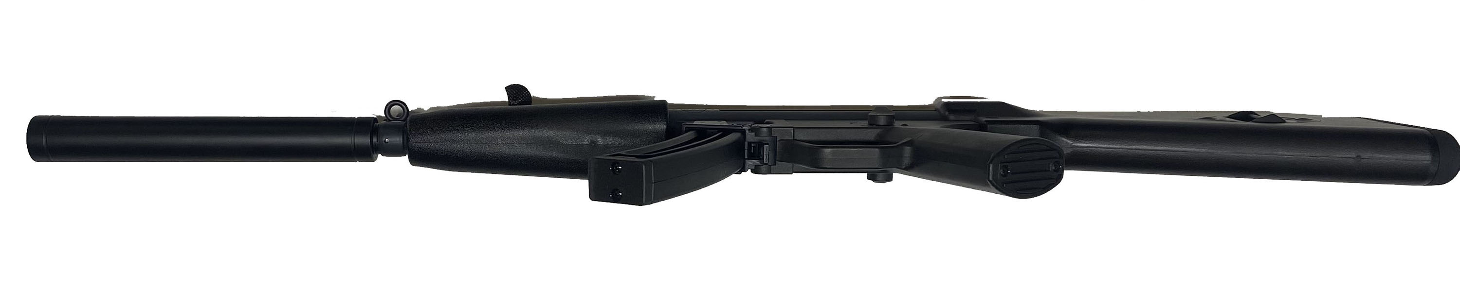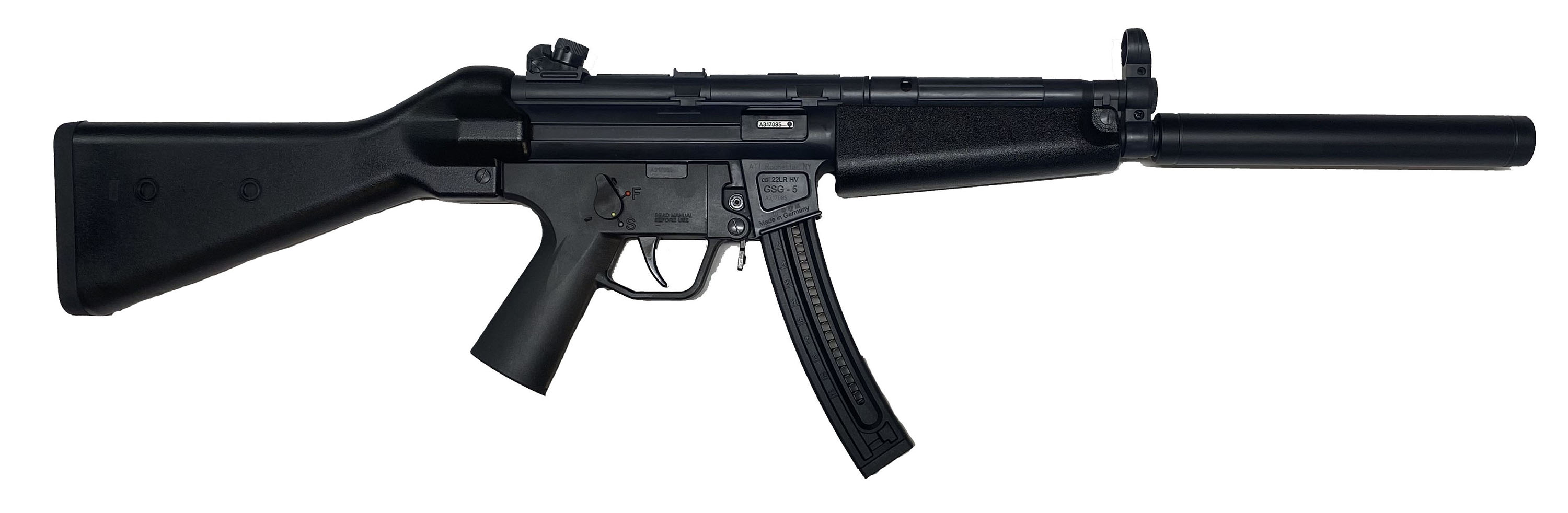 GSG, Model GSG-5, CAL: 22 LR, MFG: Modern, SN: A317085, Semi Auto Rifle, 16 3/8'' barrel. The synthetic stock, grip & forend are excellent. The matte gray finish on the receiver rates 98% overall. Bore is excellent. Factory sights. The imitated suppressor is for cosmetic appearance only, it is incapable of functioning as a suppressor. The longer barrel is covered with a barrel shroud (mock suppressor) for aesthetic purposes only. This rifle externally resembles the Heckler & Koch MP5 style submachine gun. FFL Req. - Value: 300 to 600
