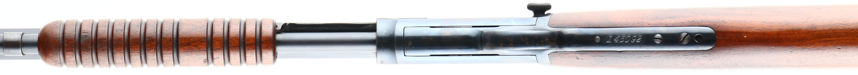 RARE Winchester, Model 90, NICKELED SWISS BUTTPLATE, 2nd variation, .22 SHORT, Cal., MFG. 1902, SN: 145092, Pump Action Rifle, 24'' Octagon barrel. This is a special order 1890 as they are rarely found with NICKELED SWISS BUTTPLATES. According to the consignor, only 22 1890 rifles were produced with the rare Swiss buttplate & most of those are deluxe models. The original straight grip wood stocks are excellent. The stocks carry the original finish, with minor handling marks & light contusions. The factory metal blue finish 95% on barrel & mag, with some light pitting on a single barrel flat on the right side near the muzzle end. The receiver blue rates 85%, with some speckled loss on the right side toning some as it thins. The rifle is fitted with an upgraded sight package, with a Lyman tang sight, adjustable rear & flip up globe sight, with ivory bead. Bore is very good, with some light wear or abrasions. This is a rare configuration & a highly desirable special order rifle.* FFL or C&R Req. - Value: 3500 to 5500