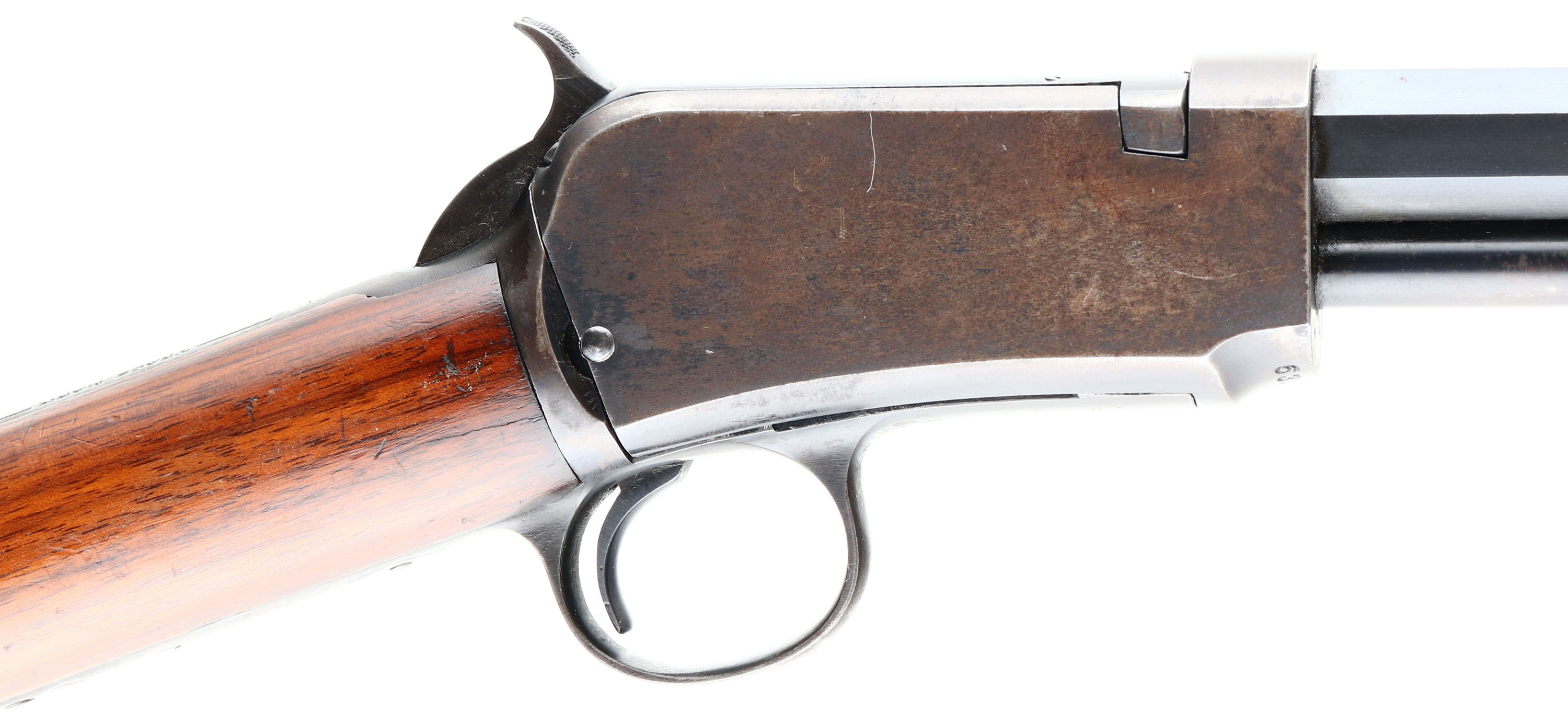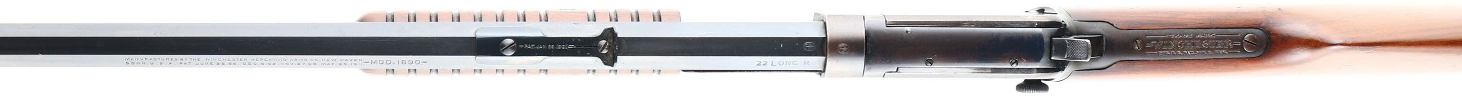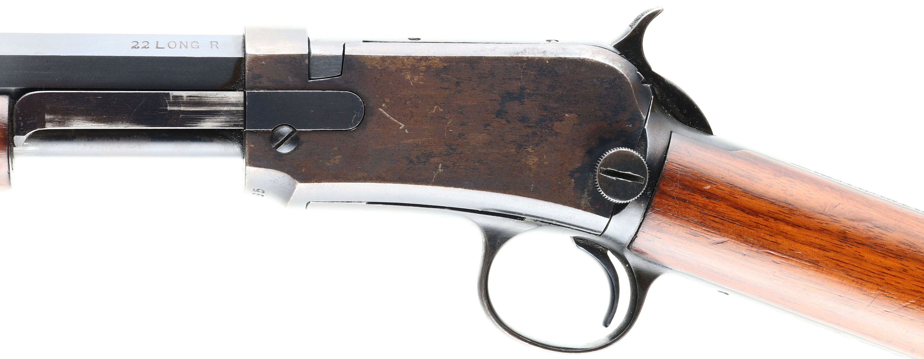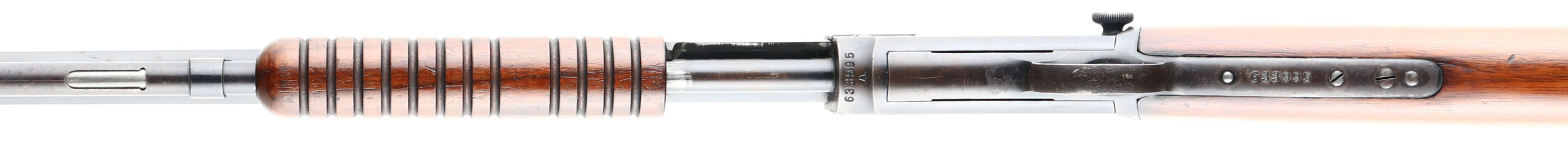 RARE Winchester, Model 90, Third Variation, CAL: 22 LONG R., MFG: 1919, SN:633995, Pump Action Rifle, 24'' Octagon barrel. Only 10% of this model were produced in single caliber LONG RIFLE, which adds a 50% increase in value amongst collectors. The original straight grip wood stocks are excellent & solid, but there are several small contusions & dings on the stock. There are also other minor scratches & scuffs to the original finish. The original metal blue finish rates 90% on barrel, 20% on mag, while the blue on the receiver has flaked or worn mostly away & has developed a thin brown patina. Bore is good, but with spotty areas of roughness amongst strong rifling. The barrel holds the original adjustable rear & small blade front sights. Buttstock carries a smooth crescent metal buttplate. Tight smooth action. A very nice, original, & fairly rare Long R marked model 90. FFL or C&R Req. - Value: 1500 to 3000