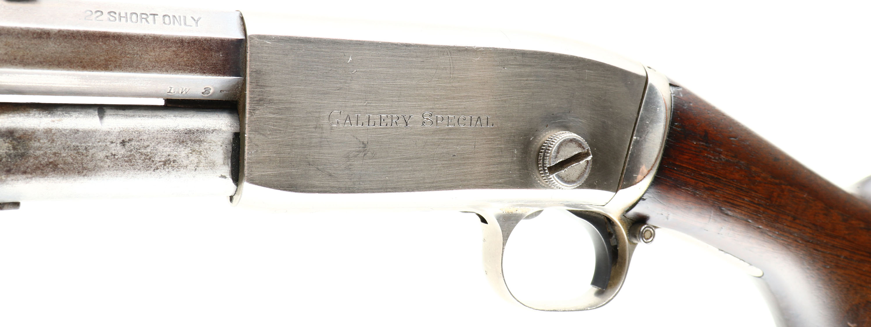 RARE NICKELED Remington, Model 12 B GALLERY SPECIAL, .22 SHORT ONLY Cal., MFG. 1910, SN: 33670, Pump Rifle, 24'' Tapered Octagon barrel, 2/3 rds mag. The Remington Model 12 is a slide-action rifle designed by John Pedersen & produced by the Remington Arms Company from 1909 to 36. The Model 12 is chambered in .22 Caliber Rimfire & accepts Short, Long, & Long Rifle cartridges, with a tubular magazine capacity of 14, 11, & 10 rounds respectively. The Model 12B ''Gallery Special'' was designed for use in shooting galleries, & can only fire .22 Short cartridges. These shooting galleries were extremely popular in the first half of the 20th century & Remington Model 12 rifles where amongst the favorites used due to their quality & reliability. This 2nd year of production ''GALLERY SPECIAL'' rifle is fairly rare. While over 800,000 Model 12 rifles were produced in it's four variations, A, B, C & CS, the model 12B saw the lowest production & is subsequently encountered far less often today. Even rarer are the half nickeled examples like this rifle. Due to their use in shooting galleries, most saw heavy use. The original factory, flat knob wood stock & honeycomb forend are very good & solid. Finish has darkened & thinned with age & use, with several minor contusions & light scratches. The original metal blue finish on the barrel & mag have worn to a thin brown patina. The NICKEL finish on receiver & crescent buttplate is excellent, retained at 98%, with a spot of thinning on the top of the receiver. All stampings & markings are crisp. Original front & rear sights. Bore is good & clean, with some cleaned roughness amongst solid rifling. A fairly rare & highly sought after popular amongst collectors grade, rare rifle. FFL or C&R Req. - Value: 1500 to 2500