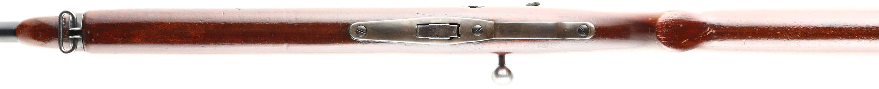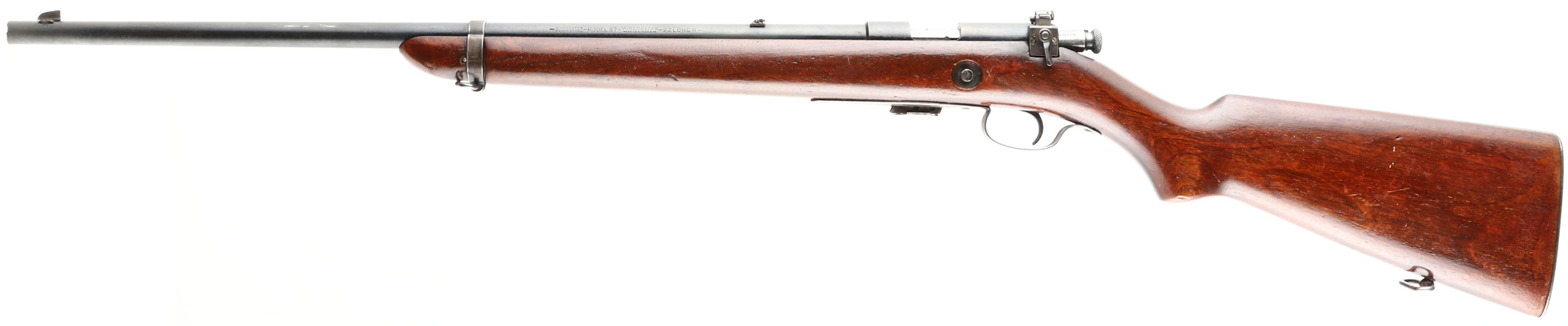 Winchester, Model 57 Target, .22 LONG R. Cal., MFG: 1927-36, SN: 28682, Bolt Action Rifle, Mag fed, 22'' barrel, with barrel band. The original flat pistol grip wood stock is very good & solid. It carries an added layer of finish over the original finish, with minor handling marks, scratches & contusions. The original metal blue finish rates 90% on the barrel, 80% on the receiver, with additional loss on the barrel band & trigger guard which are toning to a brown patina. Bore is excellent. Military style target rifle, with correct Lyman peep sight, factory sling swivels & ''Winchester'' stamped mag. Barrel fitted with a standard blade front & folding leaf rear sights. Stock carries a checkered steel buttplate. A nice condition rifle & still very collectible. FFL or C&R Req. - Value: 400 to 800