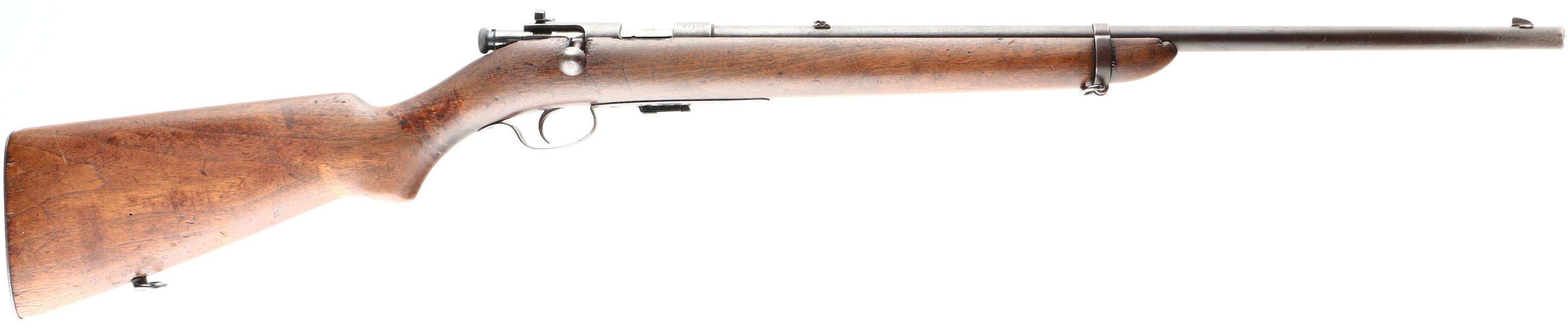 Winchester, Model 57 Target, .22 LONG R. Cal., MFG: 1927-36, SN: 17129, Bolt Action Rifle, Mag fed, 22'' barrel, with barrel band. The original flat pistol grip wood stock is very good & solid. but with numerous small handling marks, scratches, contusions & gouges to the thinned original finish. There is a small missing edge chip at the right side of forend tip The metal blue finish has worn, thinned & toned to about 40% coverage of a brown patina. Bore is very good & bright. Military style target rifle, with correct Lyman peep sight, factory sling swivels, & ''W'' stamped mag. Barrel fitted with a small blade front & folding leaf rear sights. Stock carries a checkered steel buttplate. A well used, but still original & collectible rifle. FFL or C&R Req. - Value: 300 to 600