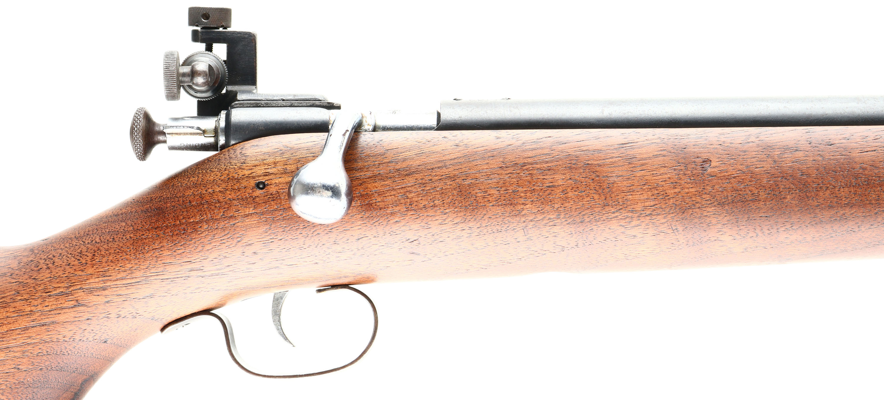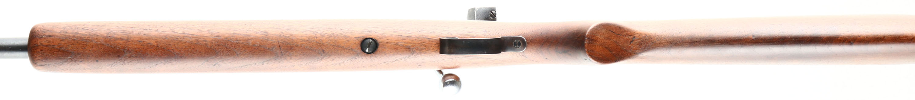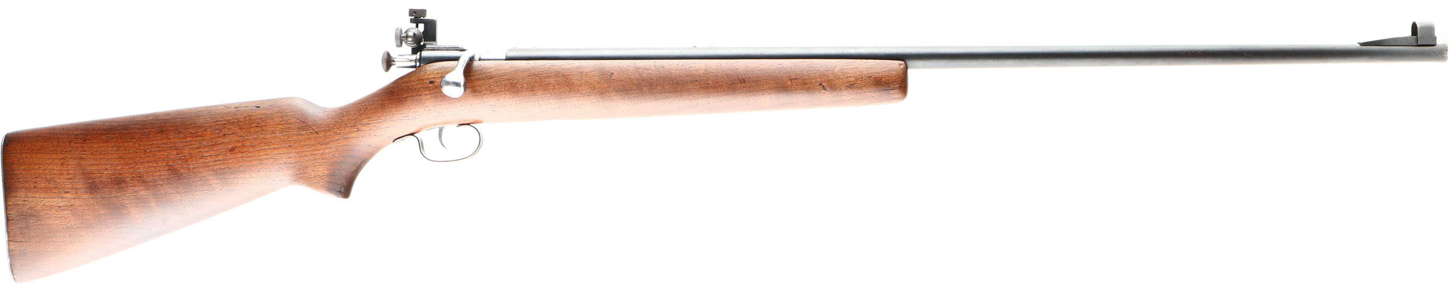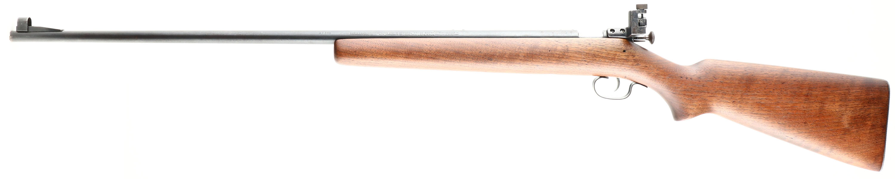 RARE Winchester, Model 67, 2nd Issue (677 Variation), CAL: 22 S.L.LR, MFG: 1937-42, SN: 02345, Bolt Action Rifle, 27 1/8'' barrel. This variation of the Model 67 is referred to as the ''677'', derived from its catalog number G67750R. This rifle is a repatriated WWII Lend-Lease rifle sold to Britain for homeland defense & marksmanship training. According to British proof house records, Winchester sold the British Government scoped Models 67, 677, 69 & 697 rifles. This is one of those rare British Model 677 rifles. The proof marks, model & serial number were not added until 1948. In 1944 British proofing requirements were suspended, hence the rifle was not proofed until 1948 before it was sold to the Parker Hale Co. The professionally refinished flat pistol grip wood stock is excellent, displaying minor contusions & dings to the finish. There is a single 2'' tight hairline crack on the right side of the stock emanating from the buttend. The metal blue finish on the barrel rates 90% overall, with spotting & speckling, & toning to a brown patina in areas of thinning. Bore is excellent. The original Winchester scope was removed & Parker Hale mounted a Model PH16 micrometer rear peep sight & ramp elevated hooded front sight, original scope mounting holes have filler screws. Originally, the rifle was issued with either a 5 or 2 3/4 power scope & there were no dovetails for iron sights. At some point, the Winchester scope was removed & the iron sights were added, thus converting it to a ''Target'' or ''Match'' rifle. Stock carries a checkered steel buttplate. This is a very rare rifle with an unusual history. Highly collectible! FFL or C&R Req. - Value: 500 to 1000
