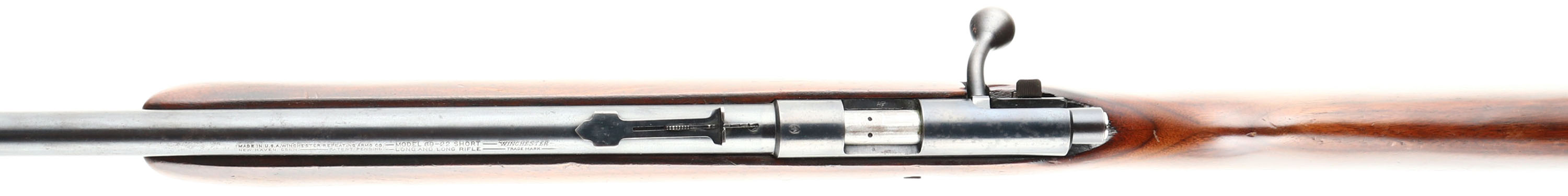 Winchester, Model 69, CAL: 22 S,L, & LR, MFG: 1935-63, SN: NONE, Bolt Action Rifle, 25'' barrel. The original flat pistol grip wood stock is very good, with original finish showing thinning, scratches, scrapes & contusions. The original metal blue finish rates 85% overall, with some speckling on the barrel. Bore is very good. The rifle is fitted with an adjustable rear sight & small blade front sight. Buttstock carries a Winchester marked plastic buttplate, with a small missing chip of wood from the stock at the top edge of the buttstock. Comes with original ''Winchester'' ''69'' marked magazine. A very nice original example. FFL or C&R Req. - Value: 300 to 600