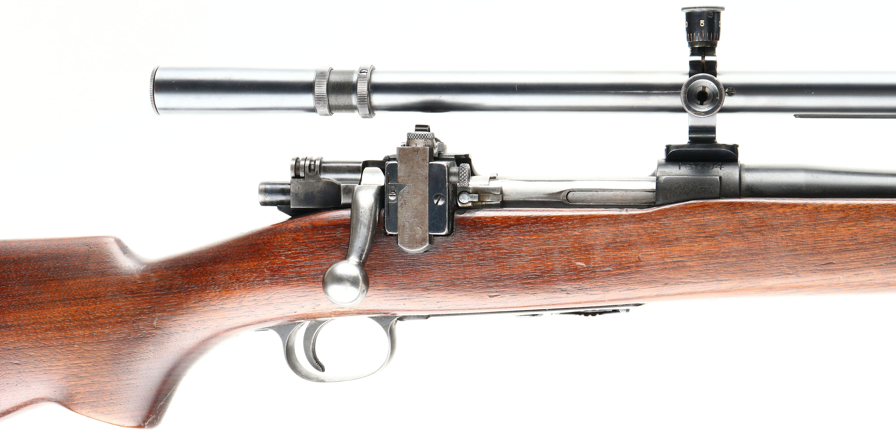 U.S Springfield, M1922M1 Training Rifle, CAL: 22, MFG: 1929 (barrel date), SN: 18754, Bolt Action Rifle, 24 1/2'' barrel. The original flat pistol grip wood stock is excellent. There are minor handling marks to the finish. The military style metal finish rates 97% overall, with light speckling on the receiver. The top of the receiver is marked '' U.S. SPRINGFIELD ARMORY M1922M1 CAL.22 18754 ''. The muzzle end of the barrel is marked in three lines ''S.A. (Flaming Bomb) 8-29''. Bore is excellent. The rifle is fitted with the original Lyman 48 adjustable rear target sight & a elevated hooded post front sight. Additionally, this rifle holds a Lyman Targetspot 10 Power scope on dovetail blocks. Stock holds the original thick checkered metal buttplate. The rifle still carries the original leather sling, connected to the front barrel band & rear sling loop. A very nice example of a 1922M1 Training Rifle. FFL or C&R Req. - Value: 1000 to 1500