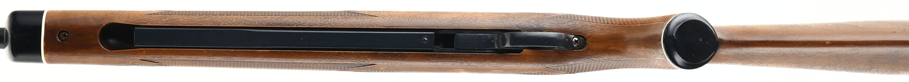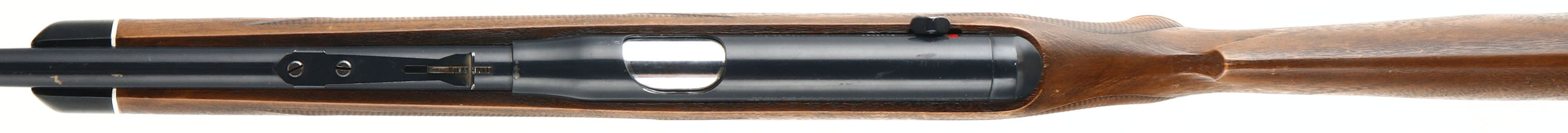 Daisy & Heddon, VL Rifle, CAL: .22 Cal. Caseless VL Ammo, S/N: A036033, 18'' barrel. The original checkered & capped pistol grip wood grain plastic stock, with ebony forend tip is excellent & solid. There are scratches, scrapes & a few thinning areas of the high gloss finish. The metal blue finish rates 97% overall, with a couple areas of flaking revealing metal grey that's toned to a brown patina. Bore is fair, dark & rough. The barrel holds an adjustable rear sight & ramp elevated blade front sight. Stock carries a VL grooved plastic buttplate. FFL Req. - Value: 200 to 400