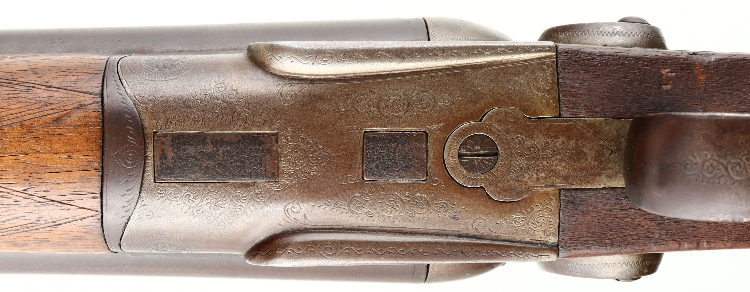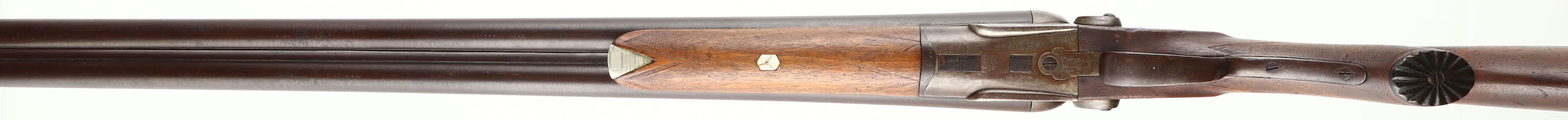 Roberts, Model: Goose Gun, Cal: 8 Ga, MFG: 1893-97, S/N: 2010, Break SxS Shotgun, 36'' damascus barrels. The checkered flat knob semi-pistol grip wood stock is very good with checkering wear, light nicks, dings, & wear from use/age, different color wood star embedded in left & right side of stock. The metal on the barrel has toned to a brown patina with remnants of the damascus pattern, the metal on the receiver has toned to a light brown patina with spots of gun metal gray. Left & right side of receiver is marked ''ROBERTS GOOSE GUN'', ''BELGIUM'', all side of the receiver is marked with nice ornamental engravings. Bores are very good, left bore has light roughness, right bore has roughness & light pitting. Barrel rib holds a bead front sight. Stock carries a grooved hard rubber buttplate. Lockup has a slight gap between barrels & recover & has small amount of play. LOP: 15'', DAH: 3 1/8'', DAC: 1 3/4''. Damascus barrels are not safe to shoot smokeless loads or steel shot out of. Antique No FFL Req. - Value: 2000 to 4000