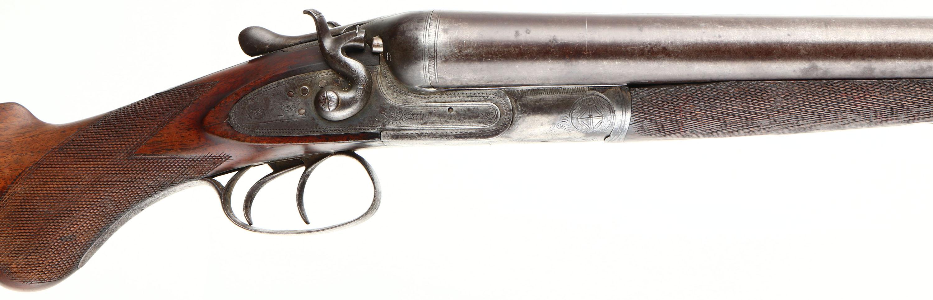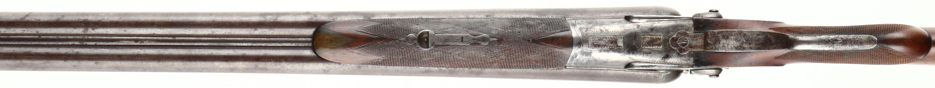 J.P. Clabrough & Bros, 8 Ga, MFG: 1904-25, S/N: 174, Break SxS Shotgun, 35 3/4'' Damascus barrels. The checkered round knob semi-pistol grip wood sock is very good with light nicks, dings, dents, & wear from use/age, three streak stains on right side of stock, silver pendent in belly of stock. The metal on the barrel has toned to a brown patina with faint remnants of the damascus pattern remaining, the receiver was left in the white & has brown/gray patina. Left & right side of the receiver is marked with ornamental engravings with a scene of game birds, top & bottom of receiver has ornamental engravings. Bores are very good with roughness in left barrel. Barrel rib carries a bead front sight. Stock holds a checkered hard rubber plate that's marked ''CLABROUGH'S DUCK & QUAIL GUN'', ''TRADE-MARK'', with a picture of a hunting dog with a duck in its mouth. Lockup is tight with no play. LOP: 14 1/2'', DAH: 2 7/8'', DAC: 1 5/8''. Damascus barrels are not safe to shoot smokeless loads or steel shot out of. FFL or C&R Req. - Value: 1500 to 3500