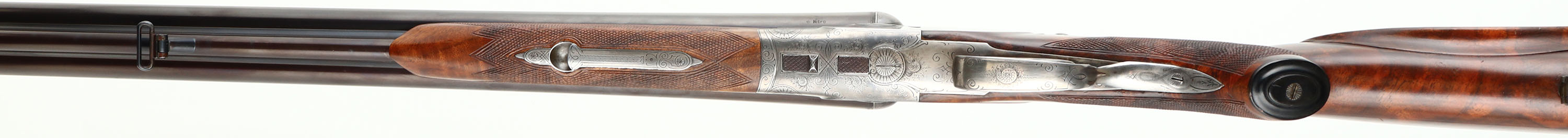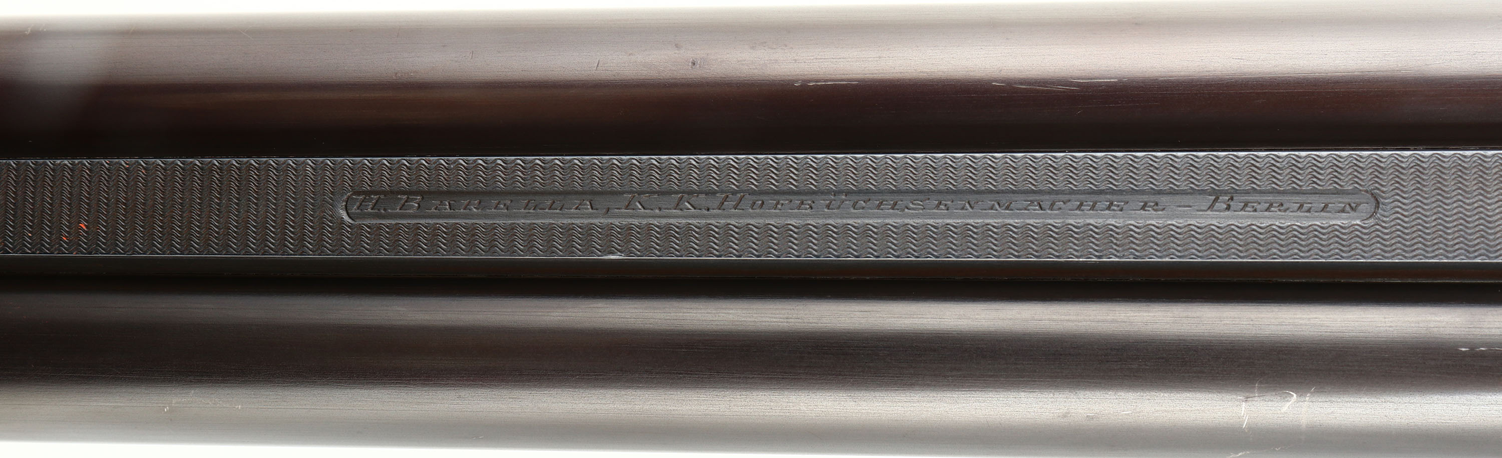 H. Barella, German 3-Barrel Drilling, CAL: 16x16x7mm, MFG: N/A, SN: 2033, Break Action Combo Gun, 26 3/4'' barrels. The tops of the barrels have a roll stamp that reads in a circular fashion ''KRUPP STAHL'', with an accent design in the middle. The sides of the barrels next to the receiver are marked ''NITRO'', with proof marks. The original fancy checkered & capped pistol grip stock with beaded cheek & pointed forend are excellent. There are handling marks to the finish & a small chip fill at the toe. The stock has beautiful figure, with feathered & rippled grain patterns. There is a blank small gold oval nameplate behind the rear sling loop. The metal blue finish on the barrels rates 95%, slightly toned plum. The receiver, break lever, trigger guard, forend break lever & screws all display simple ornamental & accent pattern engraving. The receiver is case-hardened, mostly worn to metal gray, but retains faint case-colors in protected areas. Bores are excellent, with visible light wear. The matted barrel rib holds a pair of folding leaf rear sights & a brass blade front sight. The first flip-up sight can be utilized by pushing the lever forward on the upper tang & the second rear sight has to be manually flipped. Factory sling loops present. Stock carries a grooved plastic buttplate. A beautiful hand crafted high condition German Drilling. LOP: 14'' to front trigger, DAH: 2'', DAC: 1 1/4''.* FFL or C&R Req. - Value: 2000 to 3000