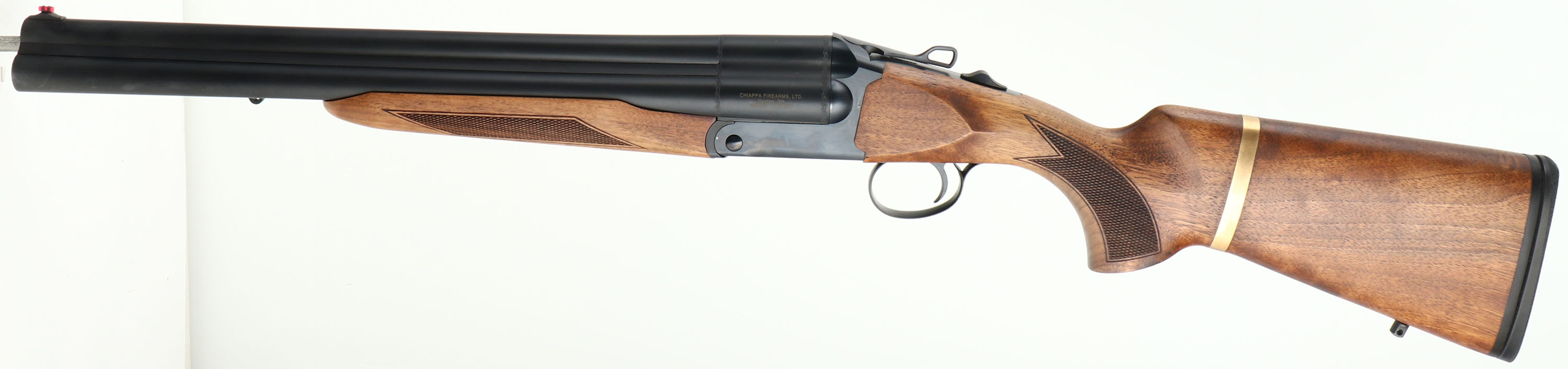 CASED NEW Chiappa, Model Triple Threat, CAL: 12 GA, MFG: Modern, SN: TC01736, Break Action SxS+ Shotgun, 18 1/2'' barrels. The original checkered & flat pistol grip walnut stocks are mint, having a hand oiled finish. Decorative brass band around stock is unusual, but factory standard. The original metal finishes are mint. Bores are mint, with screw in chokes. Comes with two additional chokes. Extractor. The top barrel holds a fiber optic front sight. Single non-selective mechanical reset single trigger system. Manual Safety. Sling studs. Buttstock carries a solid recoil pad. LOP: 14 1/4'' overpad. Comes in its original hard case, with packaging, extra chokes, choke tool & 1/4'' ''T'' handle allen wrench. NOS, gun store inventory. A new & really cool self defense or multi use shotgun. MSRP: $2,097.00. FFL Req. - Value: 1000 to 2100