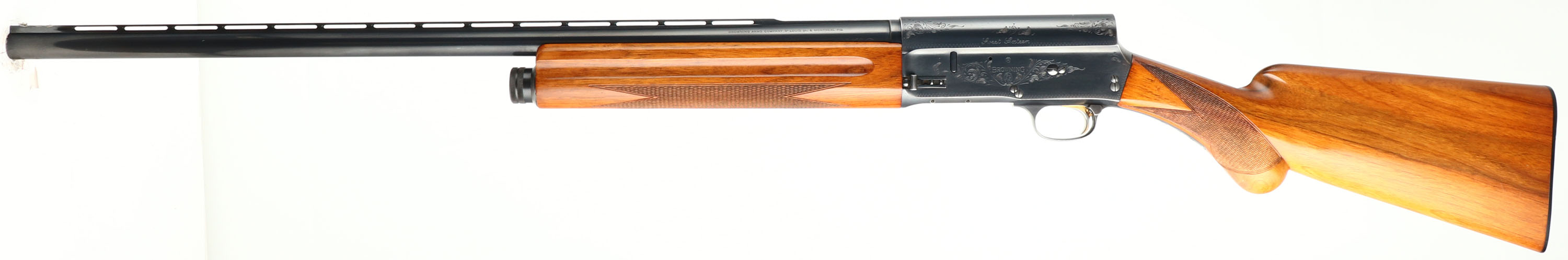 Browning, Model A-5 Sweet Sixteen, FN made in Belgium, 16 GA., MFG. 1963, SN: 3S-2444, Semi-Auto Shotgun, 2 3/4'', Marked ** or MOD choke, 25 5/8'' Ventilated rib ''Special Steel'' barrel. Barrel marked 77551. The original checkered, round knob pistol grip wood stocks are excellent, with excellent high gloss finish. There are a few tiny contusions or small scratches. The original metal blue finish is 95% overall. Barrel carries the Part # H25502. Bore is excellent. FN Browning factory buttplate. Gold trigger. Single front bead. There are a couple of ding/gouges along the left edge of the rib near the bead. Gold trigger. 14 1/4'' LOP. Overall, a high condition & collectible, Belgium made Sweet Sixteen. FFL or C&R Req. - Value: 1000 to 2000