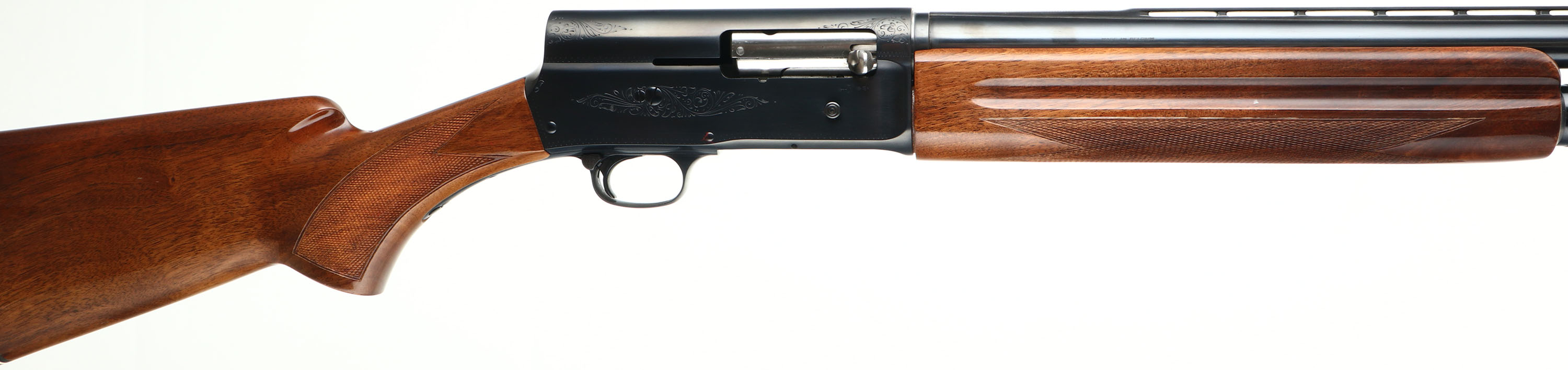 Browning, Model A5 Magnum Twelve, CAL: 12 GA, MFG: 1960, SN: 0V26145, Semi Auto Shotgun, 3'' chamber, 31 1/2'' Ventilated barrel. The checkered & flat pistol grip wood stocks are excellent, as later production replacements. There are very few light finish level handling marks to the original finish. The restored metal blue finish rates 99% overall, with some thinning of the engraving & stamping during bluing prep. The receiver displays simple scroll, vine & border engravings. Bore is excellent & bright. The ventilated rib missing the mid bead, & therefore has a single front bead. Buttstock carries a ventilated Browning recoil pad. 14 1/4'' LOP over pad. The bolt is a little sticky. May need to be cleaned & oiled. A nice looking Magnum & a great duck or goose gun. FFL or C&R Req. - Value: 400 to 800