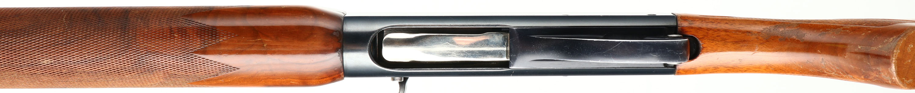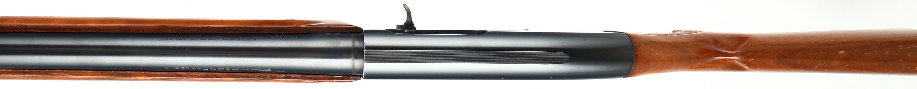 Remington Model Mohawk-48, 12 GA, MFG: 1972, SN: 5268141, Semi-Auto Shotgun, Choke: Full, 30'' Barrel. The original checkered & flat pistol grip wood stocks are excellent, with minor scrapes, contusions & some edge shipping or flaking to the original factory finish. The metal blue finish rates 99% on the barrel, 95% on the receiver. Bore is excellent. Single front bead. Buttstock carries a Remington marked buttplate. Gold trigger. LOP: 14''. FFL or CCR Req - Value: 350 to 700