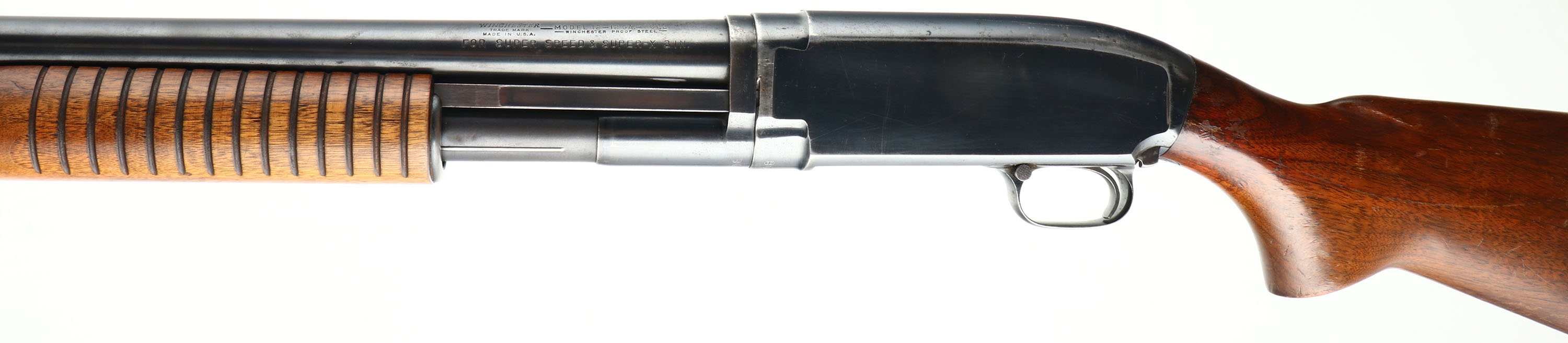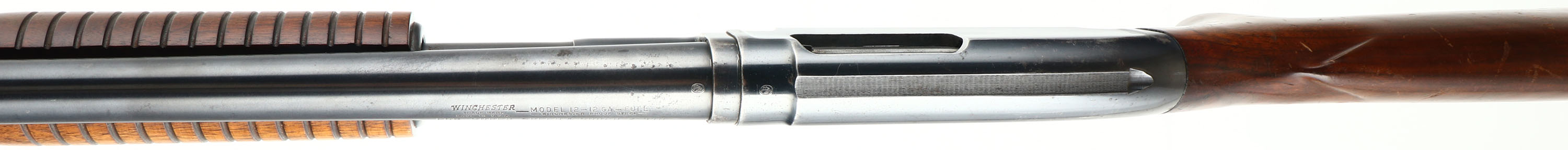 Winchester, Model 12 Heavy Duck, CAL: 12 GA, MFG: 1953, SN: 1520708, Pump Action Shotgun, Choke: Full, 3'' Chamber, 30'' Barrel. The original flat pistol grip wood stock & long corncob forend are excellent, displaying numerous dings, scrapes & scratches the original finish. The original metal blue finish rates 90% on the barrel, 80% on the receiver & mag, with some light speckling. Bore is excellent. Single front bead. Buttstock carries a solid Winchester recoil pad. LOP: 13 1/2'' overpad. FFL or C&R Req. - Value: 500 to 800