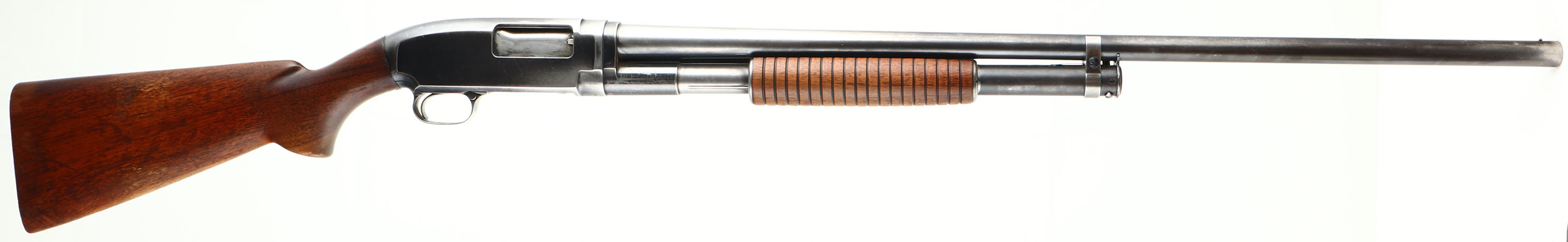 Winchester, Model 12, CAL: 12 GA, MFG: 1940, SN: 855489, Pump Action Shotgun, Choke: Full, 2 3/4'', 30'' Barrel. The original flat pistol grip wood stock & long corncob forend are very good, displaying minor scratches, scrapes, contusions & thinning to the original finish. The original metal blue finish rates 50% overall. Bore is excellent. Single front bead. Matted top of receiver. Buttstock carries no buttplate. LOP 13 3/4'' over pad. FFL or C&R Req. - Value: 300 to 600