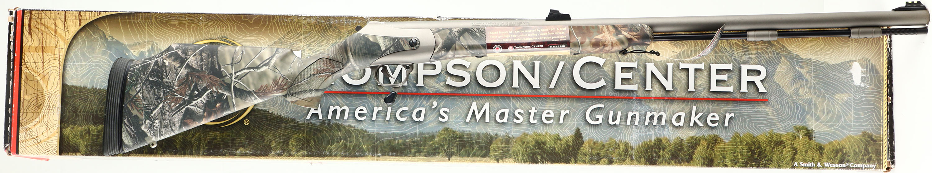 BOXED Thomson Center, Triumph Muzzle Loader, Cal. 50 Black Powder, Break Action, Mfg: modern, SN: 25709, 28'' barrel, Magnum muzzleloader, Weathershield, all purpose camo stock is mint, factory finish is 99%, has factory fiber optic sights front & rear, has been factory drilled & plugged for scop mount, sling studs, box has hang tags & paperwork. NO FFL Req. - Value: 300 to 500