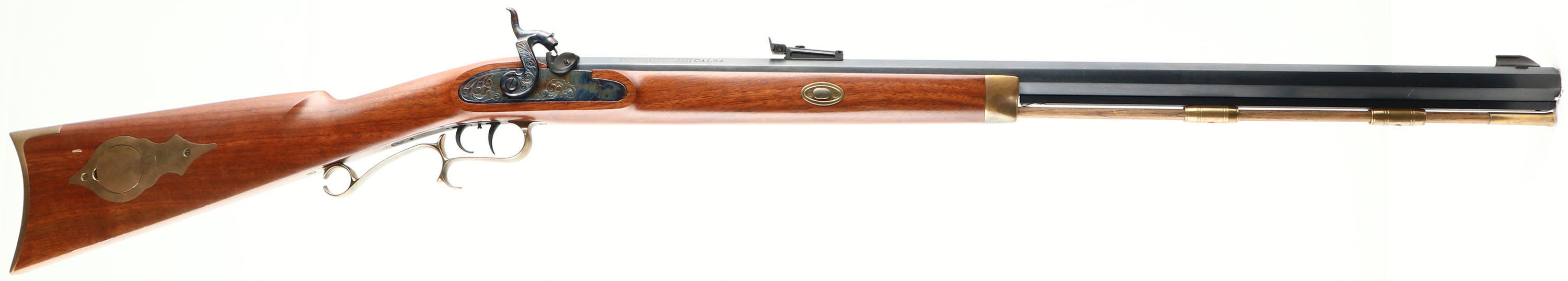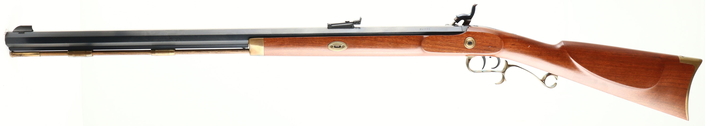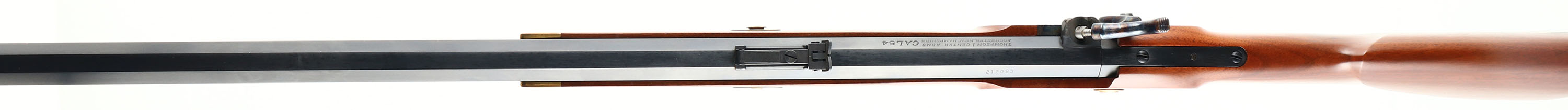 Thompson Center Arms, Muzzleloader, CAL: 54, MFG: Modern SN: 212083, Black Powder Percussion Rifle, 28 7/8'' octagon barrel. The original straight grip wood stock with raised cheek is excellent. There are minor handling marks to the original finish. The metal blue finish on the barrel rates 99% & the case-hardened side plate & hammer retains vivid case-colors. Brass furniture. Bore is excellent. Factory sights. Stock has brass crescent buttplate. A modern muzzleloader ready for the woods. Black Powder, No FFL Req. - Value: 200 to 300