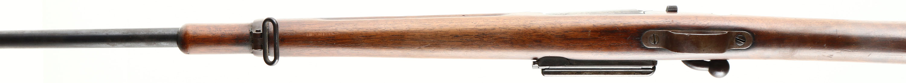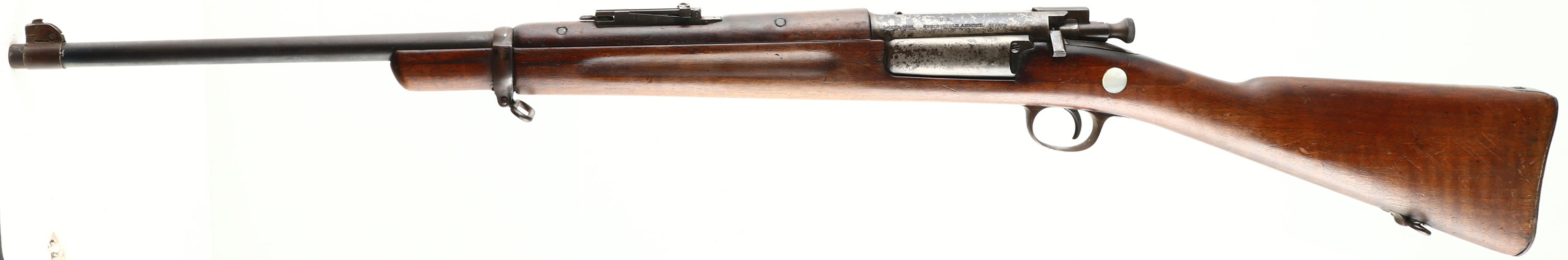 Springfield Armory, Model: 1898 Krag, Cal: .30-40 Krag, MFG: 1900, S/N: 259563, Bolt action rifle, 22 1/4'' Barrel. The cut down straight wrist wood stock is very good, stock has nicks, dings, dents, scratches, & wear from use/age, plug fill in where the hole for the cleaning used to be, small circle carved out of right side of stock for bolt handle, inlaid pearl colored circle on left side of stock above trigger, no visible cartouches, upper handguard has four hairline cracks Infront of rear sight block, two of them appear to have been repaired. The metal finish on the barrel rates 75% with wear, scratches, & patina, the metal finish on the receiver rates 45% with most areas worn to a gun metal gray. Left side of the receiver is marked ''U.S.'', ''MODEL 1898 SPRINGFIELD ARMORY'', & S/N. Bolt hand has been bent backwards, safety is missing. Bore is excellent, bright & mirror like. Blade on ramp front sight with, tangent/ladder V-notch rear sight marked 1 to 4 on base & 4 to 20 on ladder. Steel trapdoor buttplate with light rust & brown patina, noting inside trapdoor. Bottom sling swivels. FFL or C&R Req. - Value: 200 to 400
