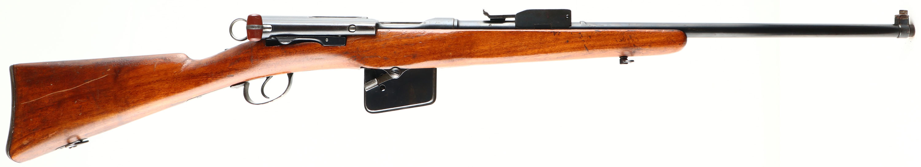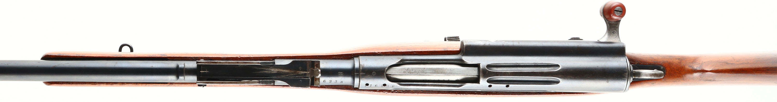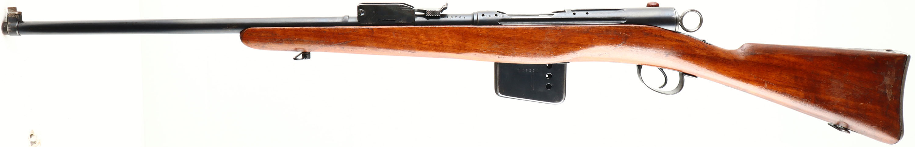Waffenfabrik Bern (Swiss), Model: M1889, Cal: 7.5x53.5mmR, MFG: 1891-97, S/N: 116238, Bolt action straight pull rifle, 22'' cut down barrel. The cut down straight wrist wood stock is good, stock has been sanded, remolded in places, ''B'' above circle with ''1'' inside. The metal finish rates 80% overall with spots of patina & thinned bluing. Left side of receiver has been drilled & tapped for a scope, S/N, & Swiss cross, barrel is marked with S/N, Swiss cross, & other proof marks, Magazine cutoff has been modified to be a magazine release, S/N matched bolt, magazine, barrel, & Butt plate. Bore is excellent, bright & mirror like with little wear. Blade front sight with tangent modified aperture rear sight, base marked 300 to 500, aperture sight block has been added to older V-notch, top of base wings have been ground down to the 500 mark. Steel butt plate with light brown patina, upper tang is marked ''6'', Swiss cross, ''238''. Bottom sling swivels. This is a rare M1889 in it un-modified configuration, the M1889 was the Switzerland's first smokeless rifle, & was the first rifle in the line of the Schmidt-Rubin straight pull rifles. This rifle will chamber modern 7.5 Swiss ammo but the action is not strong enough for the increase of pressure, it is recommend to shave down modern 7.5 Swiss cartridges to the correct length and hand down-loaded them to shoot through this rifle. Antique No FFL Req. - Value: 150 to 300
