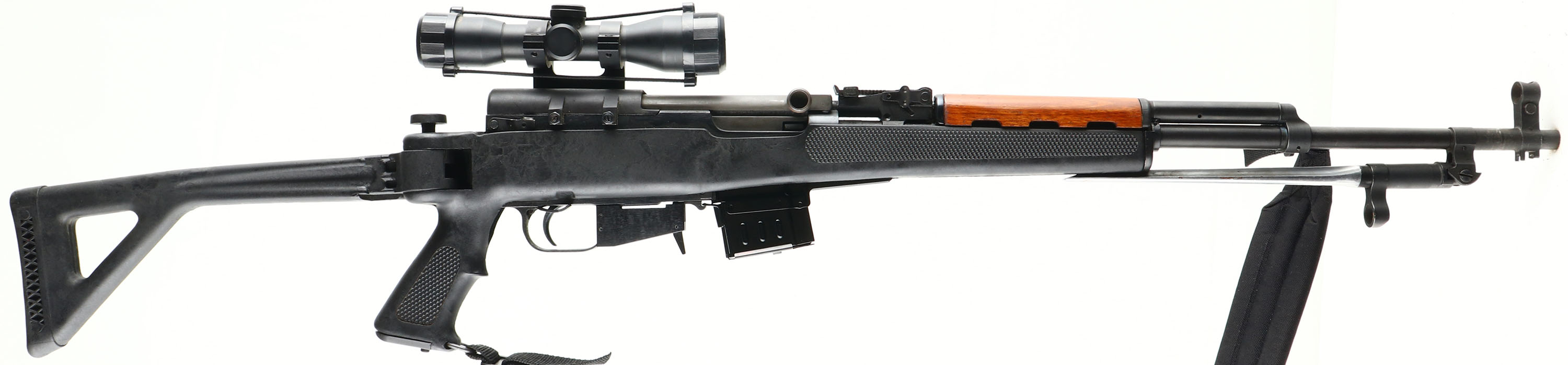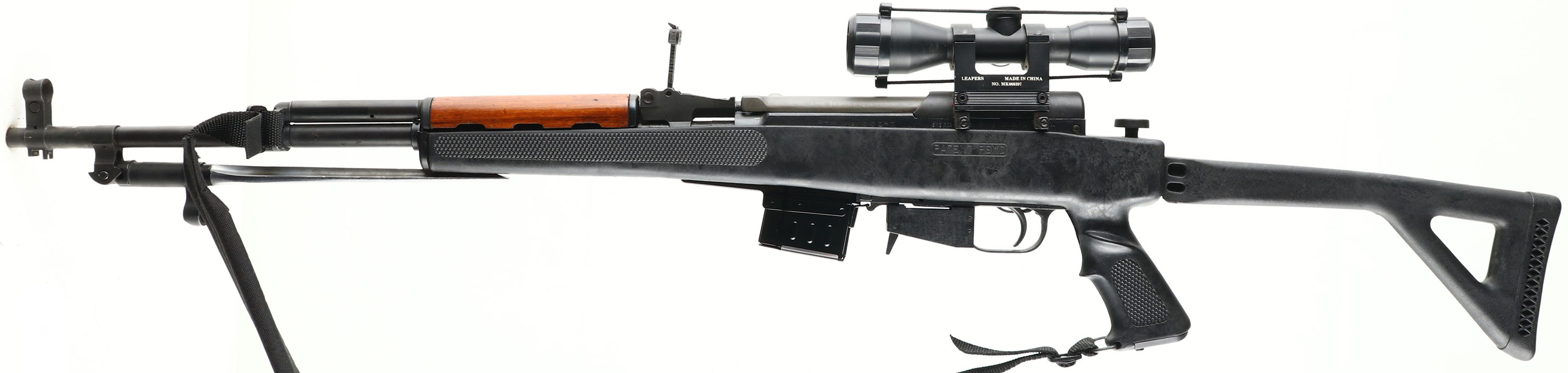 Chinese Factory 216, Model: Type 56, Cal: 7.62x39, MFG: 1973, S/N: 1812297J, Semi-auto Rifle, 20 1/2'' Barrel. The after market, folding, pistol grip plastic stock is excellent with no wear. The metal finish rates 90% overall with light wear. Left side of receiver is marked ''216'' in triangle, ''Type 56 CARBINE'' in Chinese, S/N, & importer stamps, Bolt, & trigger guard are S/N matched. Bore is Excellent, bright & mirror like. Hooded post front sight, tangent U-notch rear sight marked 1 to 10, comes with a Leapers 6x32 scope & a Leapers scope mount. Plastic butt pad. One bottom & one side sling mount, coms with black nylon sling, bayonet has been cut down & re-shaped. FFL or C&R Req. - Value: 350 to 700
