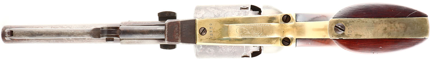 DESIRABLE & ENGRAVED, Colt, 3rd Model Dragoon, CAL: .44, MFG: 1853 SN: 13579, Single Action Revolver, 7 1/2'' barrel. Colt only produced 10,500 of these pistols from 1851-61, with the serial number range being from 10,200 - 19,600. This particular example carries all matching serial numbers. The wood grips are very good, as having been sanded & refinished leaving the metal proud to the wood. They display minor contusions & handling marks. The metal finish has worn to a mix of metal gray & brown patina. The brass trigger guard/grip has been polished & cleaned, with a thin aged patina. The frame, barrel housing, backstrap & trigger guard/grip all display fantastic custom, ornamental scroll hand engraving. The cylinder displays the Texas Ranger & Indian fight scene. Bore is excellent. Barrel has brass blade front sight. A rarely seen Dragoon & one with strong eye appeal. Antique, No FFL Req. - Value: 7500 to 15000