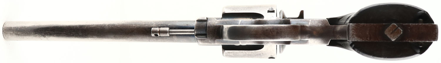 Colt, New Service, CAL: 44 Cal. (44-40), MFG: 1904, SN: 12113, Double Action Revolver, 7 1/2'' barrel. The checkered on the ''COLT'' plastic grips has worn mostly smooth & the initials ''SWS'' are carved into the right grip & the date ''JULY 1919'' into the left grip. The bottom corners of each grip have a 1/4'' missing chip. The original metal blue finish has worn mostly gun metal gray, with thinned blue & a thin brown patina remain in frame & cylinder on protected areas. Bore remains very good & bright. The barrel holds a blade front sight. Butt missing lanyard swivel. Action & cylinder are tight & timing functions properly. An original, well used & loved New Service with lots of stories to tell & lots of quality life remaining. FFL or C&R Req. - Value: 400 to 800