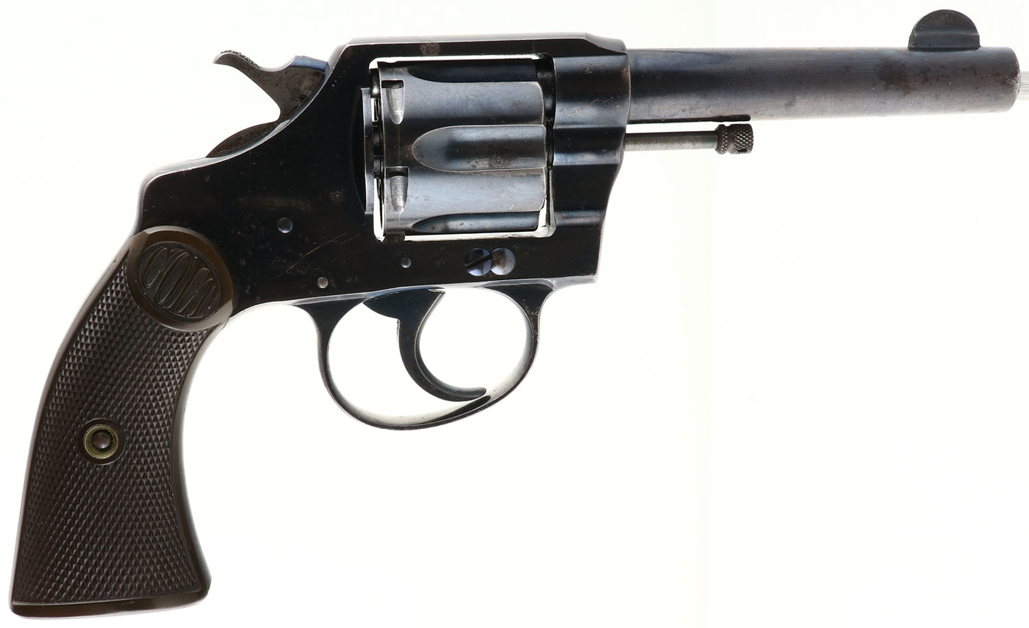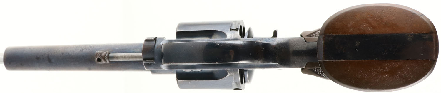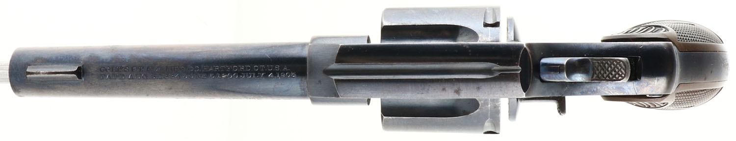 Colt, Police Positive, New Police, CAL: 38, MFG: 1906, SN: 6895, Double Action Revolver, 4'' barrel. The top of the barrel is marked in two lines ''COLT'S PT F.A. MFG. CO. HARTFORD CT. U.S.A.'', ''PAT'D AUG.5.1884 JUNE 5.1900 JULY 4 1905''. The left side of the barrel is marked ''COLT POLICE POSITIVE 38''. The left side of the frame is marked in a circle ''COLTS NEW POLICE'' with the Rampant Colt logo in the center. The full SN can be found on the frame & cylinder swing gate. The original ''Colt'' marked checkered hard rubber grips are excellent, but toning brown with age. The metal blue finish rates 85% overall. Bore is excellent. The barrel holds a half moon blade front sight. The Police Positive was very successful, along with the Colt Official Police. The two dominated the law enforcement firearms market in the early 1900's. FFL or C&R Req. - Value: 400 to 800