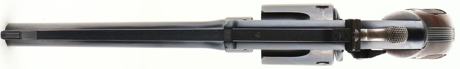 BOXED, Smith & Wesson, Model K22, CAL: .22 LR, 5 Screw, MFG: 1948, SN: K72861, Double Action Revolver, 6'' barrel, The checkered walnut grips are excellent, with light overall wear. The metal blue finish rates 97%. There is a small area of touch-up on the left side of the frame ahead of the cylinder. The case-hardened hammer & trigger retain full case-colors. Bore is excellent. The frame has an adjustable rear sight & the barrel has a serrated blade front sight. Grooved backstrap & front strap. FFL or C&R Req. - Value: 600 to 1200