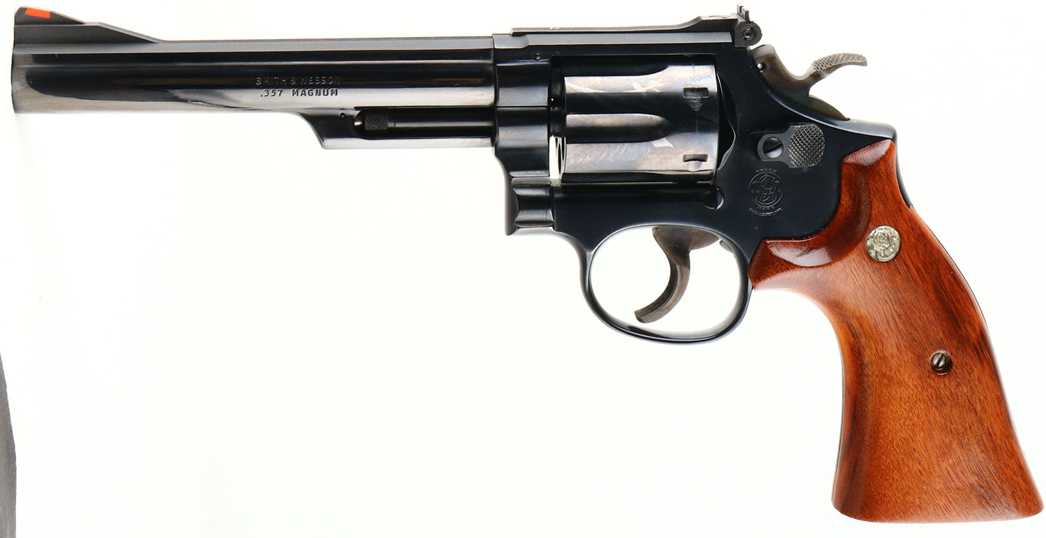 CASED, Smith & Wesson, Model 19-4 Oregon State Police 50th Anniversary Edition, CAL: 357 MAG, MFG: 1981, SN: 66K6132, Double Action Revolver, 5 7/8'' barrel. The S&W logo medallion wood grips are excellent. The high gloss finish is excellent. The right side of the frame is marked with the OSP badge & the right side of the barrel is marked in two lines ''OREGON STATE POLICE 50TH ANNIVERSARY 1931-1981''. The metal blue finish rates 99% overall. The case-hardened trigger & hammer retain vivid case-colors. Bore is excellent. The frame holds an adjustable rear sight & serrated blade front sight with orange insert. Comes in OSP presentation case, with related paperwork. FFL Req. - Value: 600 to 1000