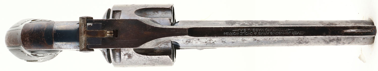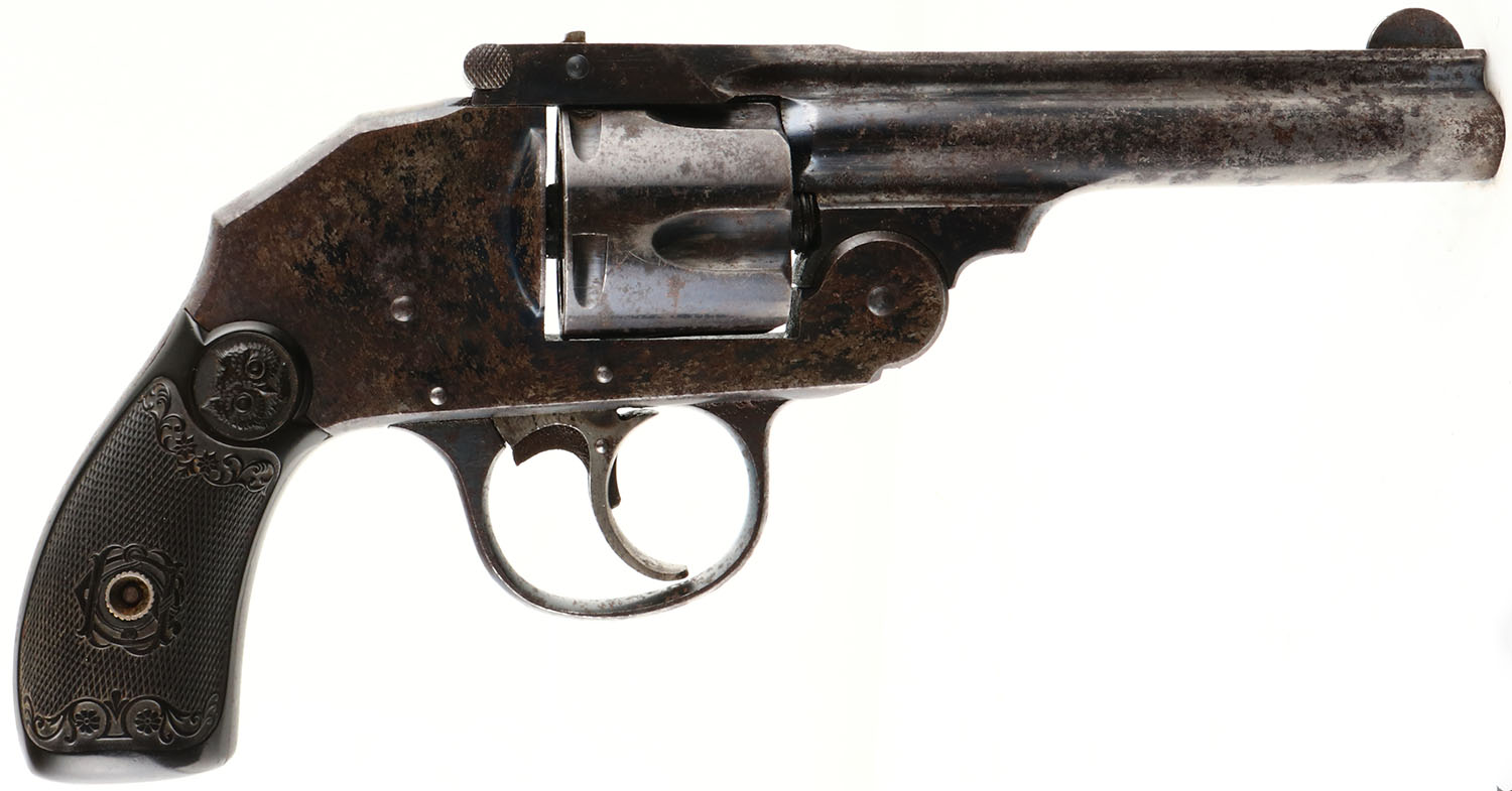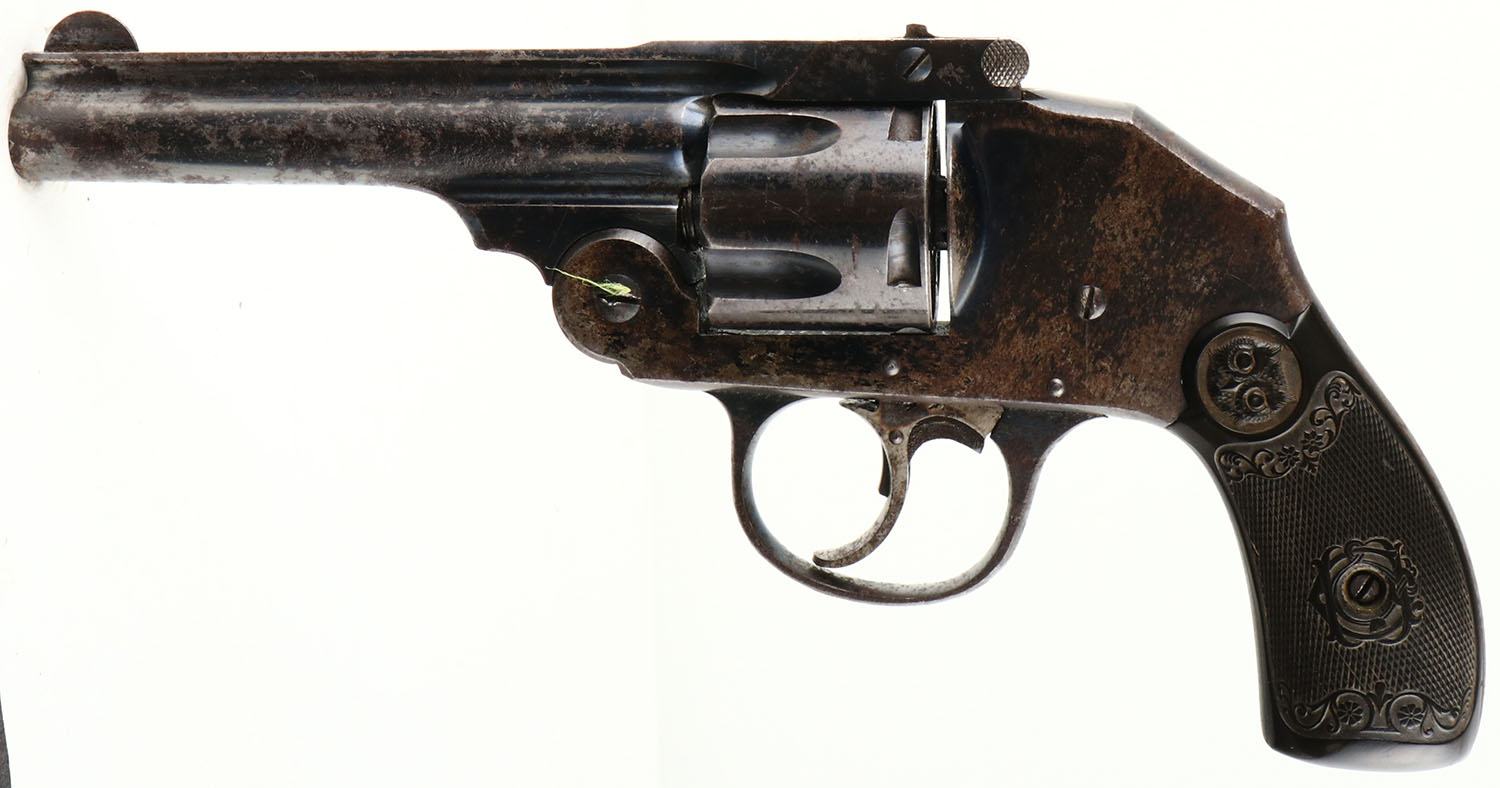 Iver Johnson, Large Frame Safety Automatic Hammerless, Second Model, CAL: 32, MFG: 1893-1900, SN: 61444, Double Action Revolver, 4'' barrel. The Owl logo, checkered hard rubber grips are excellent, with minor handling marks. The metal blue finish is a mix of remaining original blue, brown patina & areas worn to metal grey, with consistent spotting & pitting. Bore is excellent & bright, with intermittent roughness & pitting. The barrel holds a half-moon blade front sight & fixed notch rear sight. FFL or C&R Req. - Value: 100 to 300
