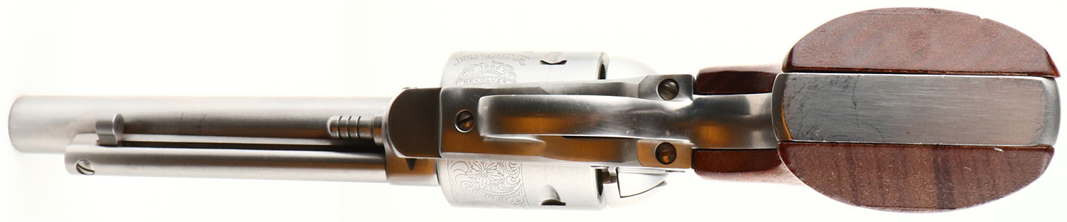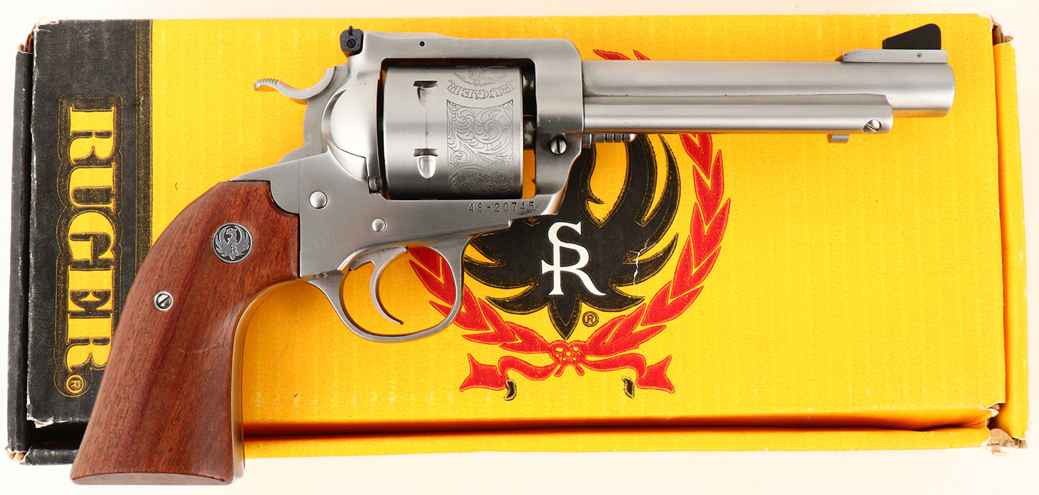 BOXED, Ruger, New Model Blackhawk, Bisley Model. CAL: 41 MAG, MFG: 2003, SN: 48-20745, Single Action Revolver, 4 3/4'' barrel. The Ruger logo medallion wood grips are excellent, with a few tiny handling marks or scratches. The polished stainless steel finish is excellent, near mint. Bore is excellent. Ruger Bisley Model floral roll stamped cylinder. Factory sights. Comes in original box. This is an excellent overall, near new old stock condition revolver from gun shop inventory. FFL Req. - Value: 500 to 1000