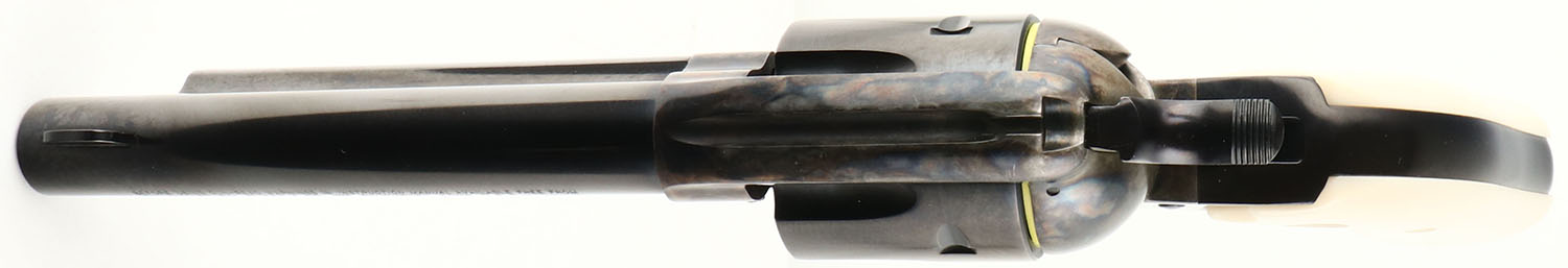 NEW, CASED, Ruger, Vaquero, CAL: 45 Colt, MFG: 2003, SN: 58-18729, Single Action Revolver, 5 1/2'' barrel. The Ruger logo faux ivory grips are excellent. The metal blue finish on the barrel, cylinder & trigger guard is near mint. The frame is case-hardened, retaining full case-colors. Bore is excellent. Barrel holds single front blade. Still has yellow cylinder spacer. Comes in original Ruger grey hard case, with bag & owners manual. NOS gun store inventory. FFL Req. - Value: 500 to 800