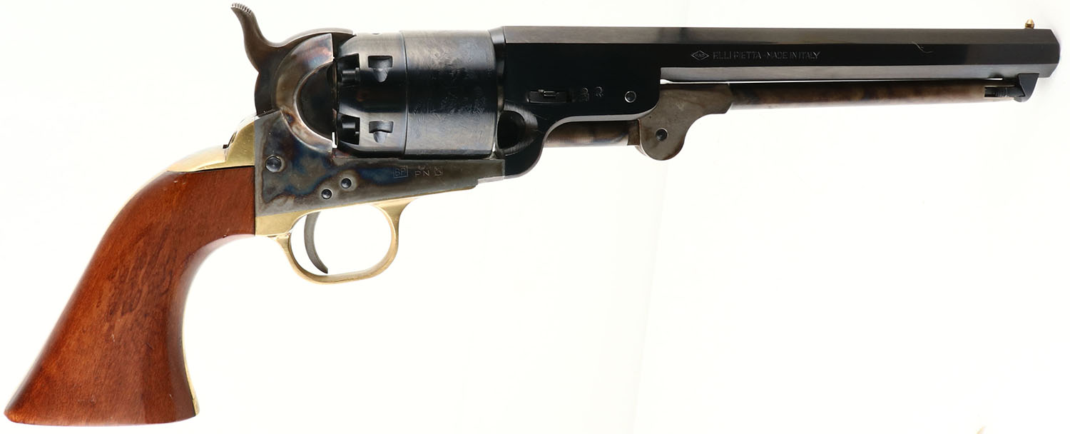F. LLI Pietta, Model 1851 Navy, CAL: 44, MFG: Modern, SN: 462354, Black Powder Percussion Revolver, 7 1/2'' barrel. The original wood grips are Excellent, with a minor wear from handling. The engraved & blued barrel & cylinder are excellent, The case-hardened frame, trigger & hammer are very good some has started to fade, all having vivid-colors. Bore is excellent. The barrel carries a single post bead. A very nice condition, modern black powder revolve. Black Powder Muzzleloader, No FFL Req - Value: 200 to 400