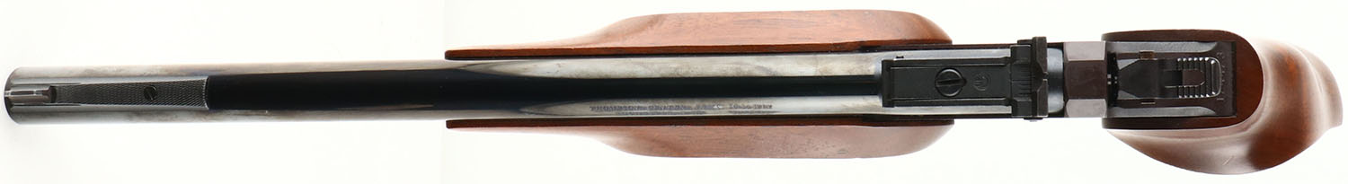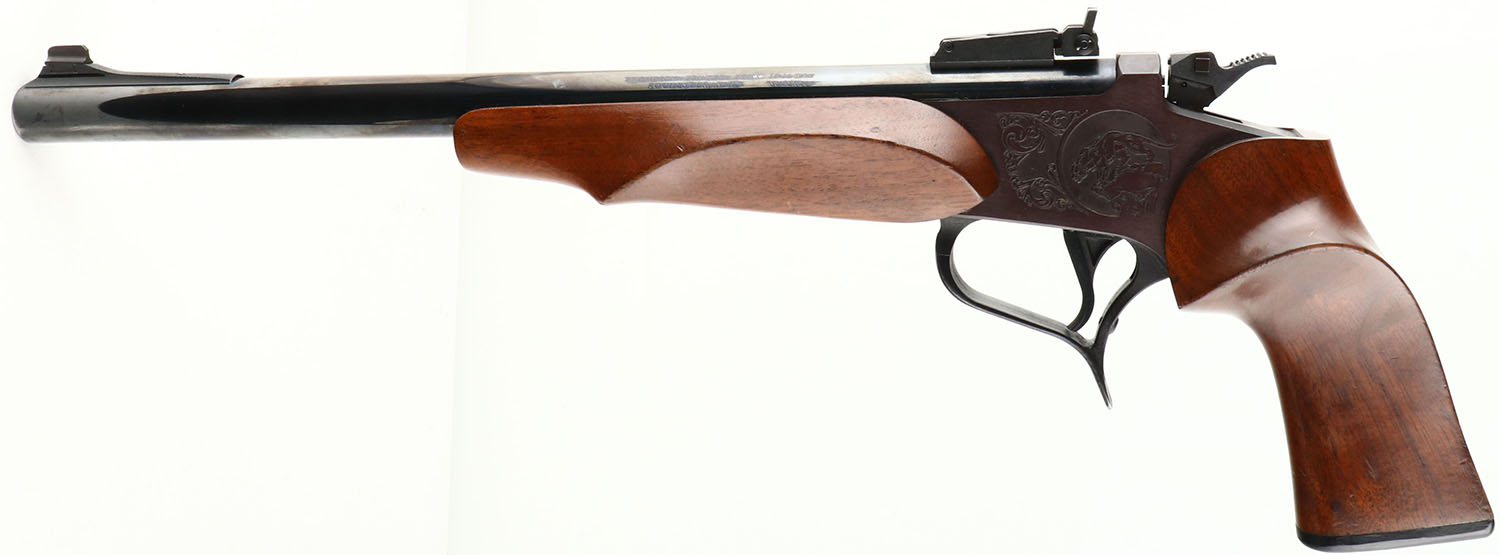 Thompson Center Arms, Model Super 14, CAL: 30-30, MFG: 1967-2000, SN: 124423, Break Action Single Shot Pistol, 14'' barrel. The original factory wood grips are excellent. The original metal finish is 97% with most of the wear at tip of barrel. Features an etched cougar perched on ledge on both sides of receiver. Bore is excellent. Factory sights. FFL Req. - Value: 600 to 1000