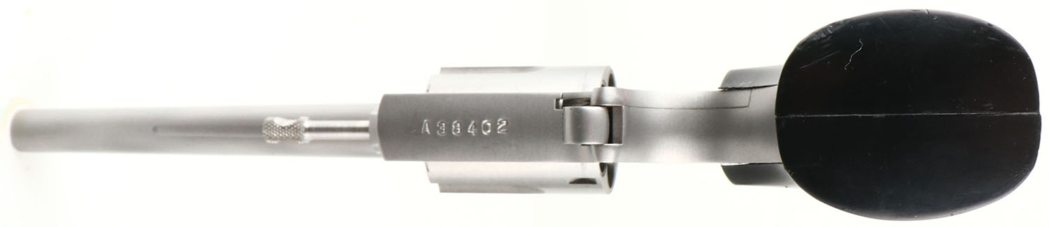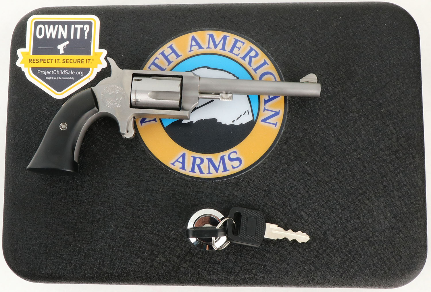 CASED, Freedom Arms, Mini Revolver, CAL: 22LR, MFG: Modern, SN: A38402, Single Action Revolver, 3'' barrel. The synthetic black grips are excellent. The stainless steel finish is excellent overall, with a faint drag line on the cylinder. Bore is excellent, with roughness at the chamber end of the barrel. Barrel holds a serrated blade front sight. Comes in NAA original locking hard case, with keys. FFL Req. - Value: 200 to 300
