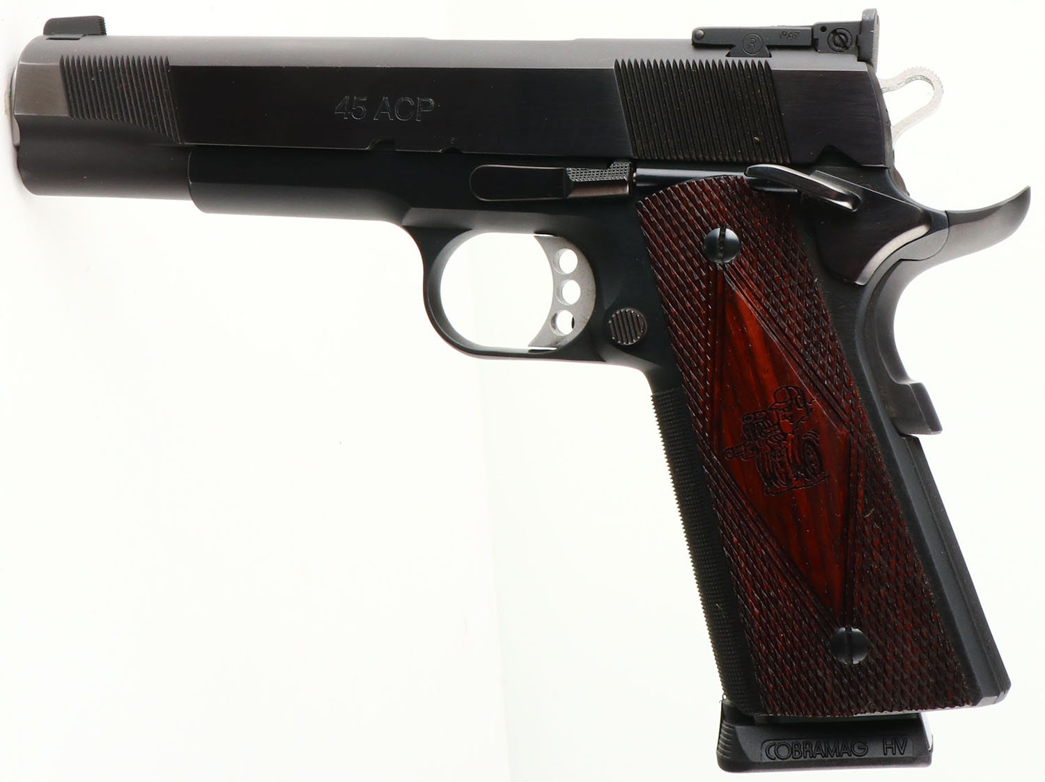 BOXED, Les Baer Custom, 1911 Ultimate Master Combat Pistol, CAL: 45 ACP, MFG: Modern, SN: LB6600, Semi Auto Pistol, 5'' barrel. The checkered wood grips with the LB logo are excellent. The factory metal finishes rate 99%+ overall. Bore is mint. The slide holds an adjustable rear sight & fixed blade front sight. Comes in original box, with magazine, owners manual, paperwork, lock/key. List of Features From Baer Website: Baer NM steel frame and NM slide with blued finish - Baer NM barrel and stainless steel bushing - Low-mount LBC adjustable sights with hidden rear leaf - Baer dovetailed front sight - Double serrated slide - Fitted slide to frame - Lowered and flared ejection port - Two-piece beveled mag well - High checkered front strap @ 30 lpi - Checkering underneath trigger guard @ 30 lpi - Serrated rear of slide @ 40 lpi - Serrated top of slide - Baer deluxe Commander hammer and sear - Baer extended ambi safety - Tuned extractor - Baer extended ejector - Baer checkered slide stop - Baer beavertail grip safety with pad - Baer mag catch - Baer speed trigger with crisp 3 1/2 lb action job - Polished feed ramp and barrel throat - Baer Premium Checkered grips - Tuned for total reliability - Blued finish. This gun retails on Baer Website for $4,083. FFL Req. - Value: 3000 to 4000