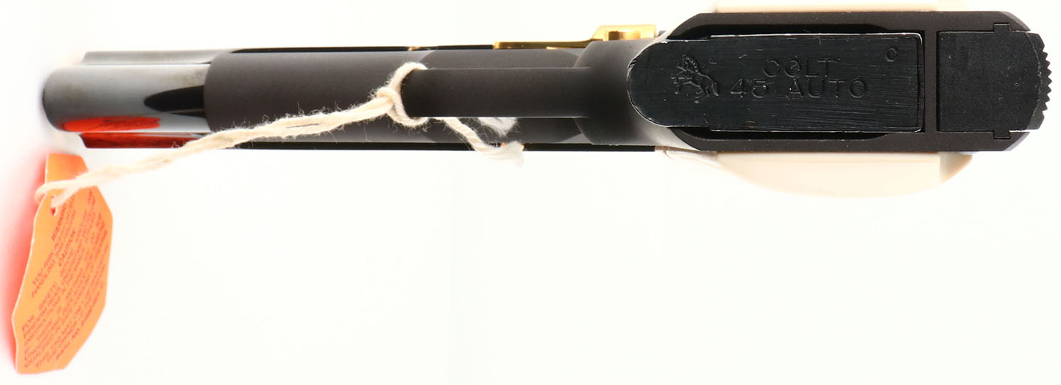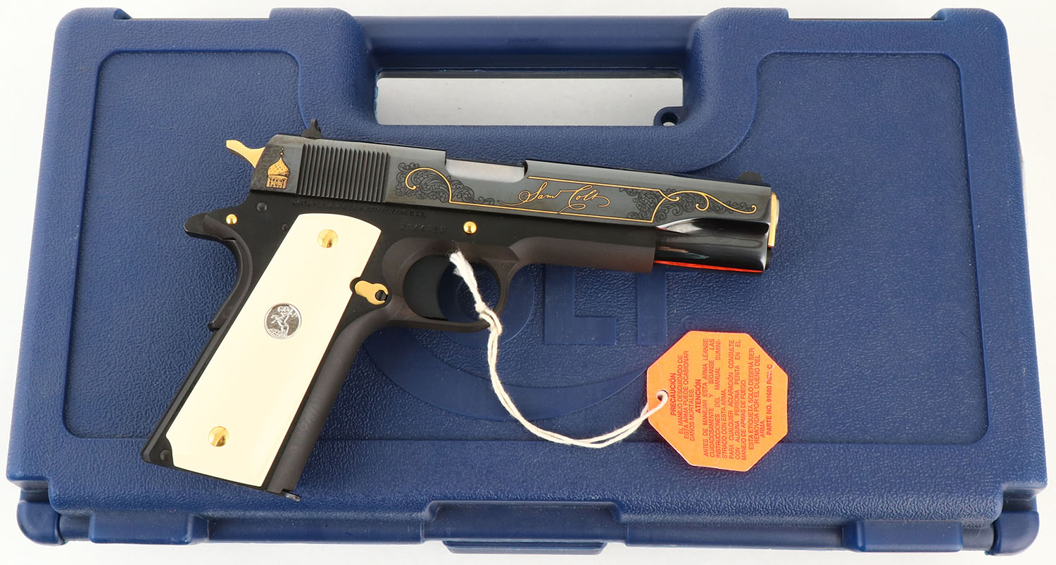 CASED, Colt Government Model Series 80 ''100 Years of Service'' Edition, CAL: 45 AUTO, MFG: 2011, SN: 2844318, Semi Auto Pistol, 4 7/8'' barrel. The silver Colt medallion faux ivory grips are excellent. The metal blue finish on the frame & slide rates 99%+. The gold tone finish on the hammer, safety, slide lock, magazine release, barrel ring & screws is excellent & bright. The left side of the slide displays beautiful ornamental scroll engraving with gold accents, is marked ''100 YEARS OF SERVICE'' in gold tone lettering & has a gold tone Rampant Colt on the back on the slide. The right side of the slide displays the same engravings & accents, with Sam Colt signature & a gold image of the iconic Blue Onion Dome on the back of the slide. The top of the slide displays a gold tone vignette of the Rampant Colt amongst ornamental engraving. Bore is mint. The slide holds white dot sights. Comes in factory hard case, with related paperwork, hang tag, extra mag & lock/key. - Value: 1500 to 2500